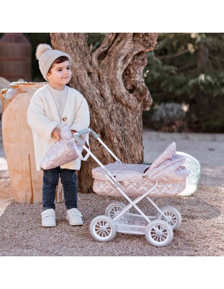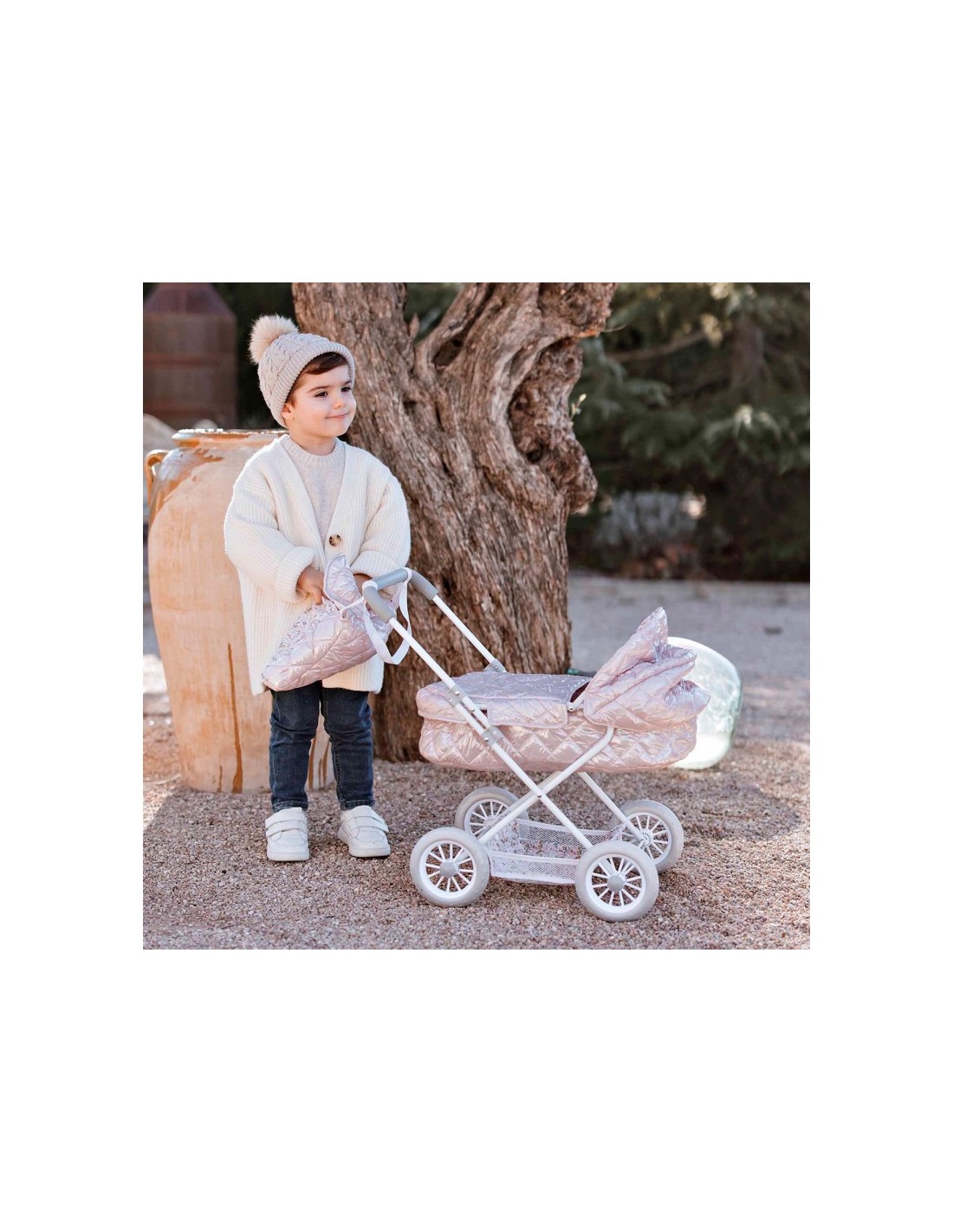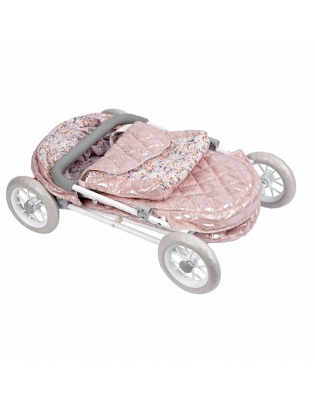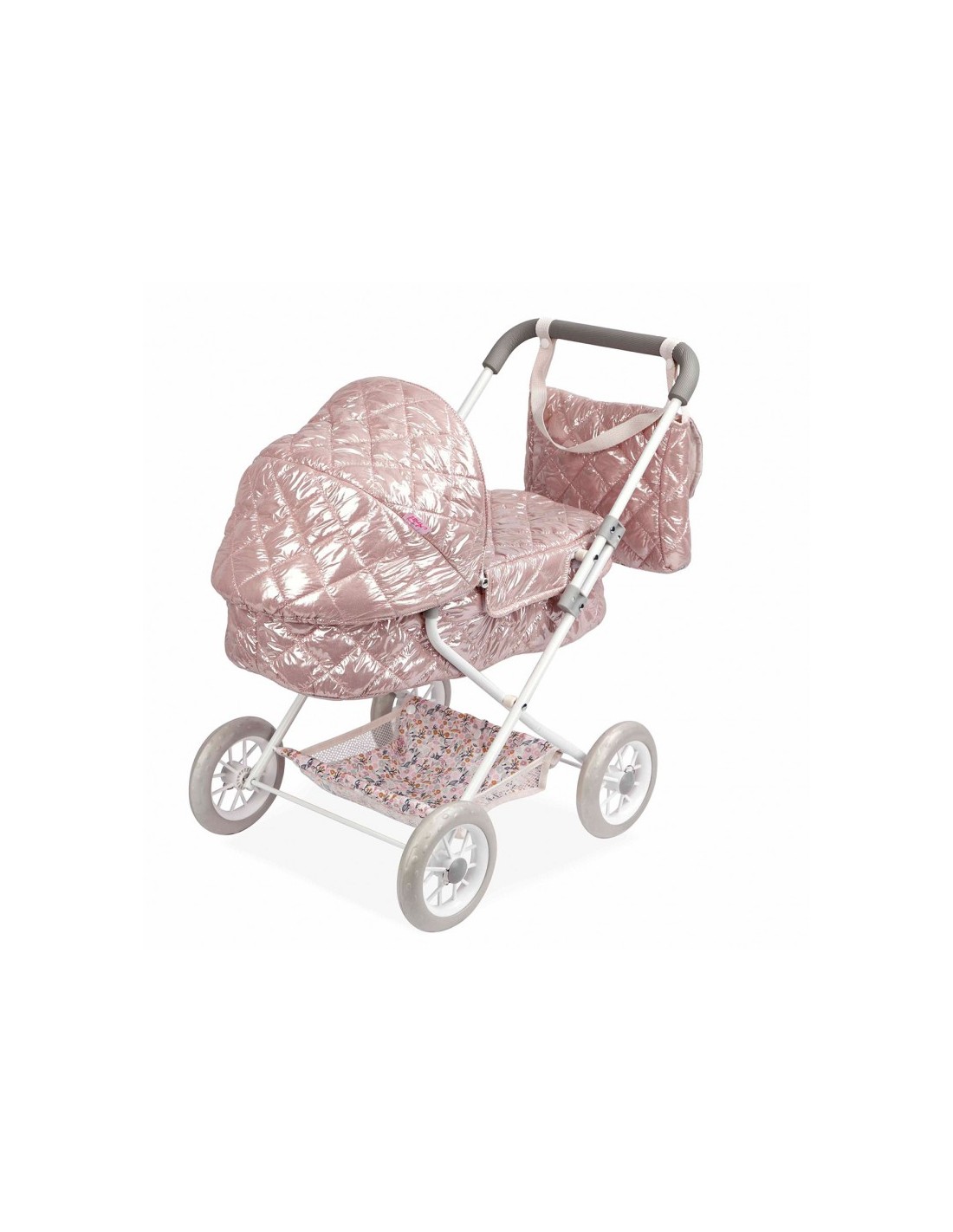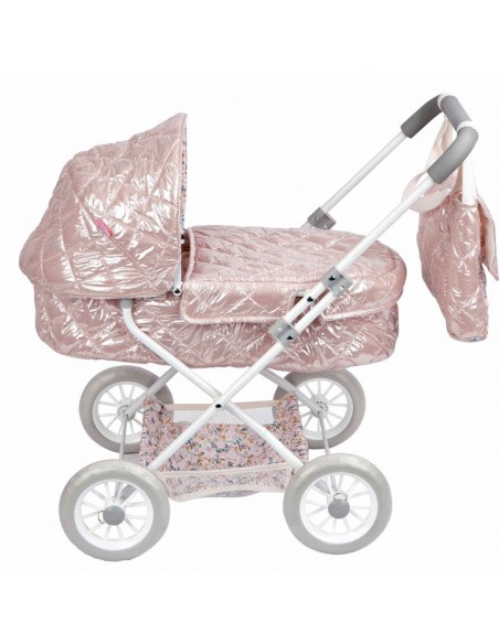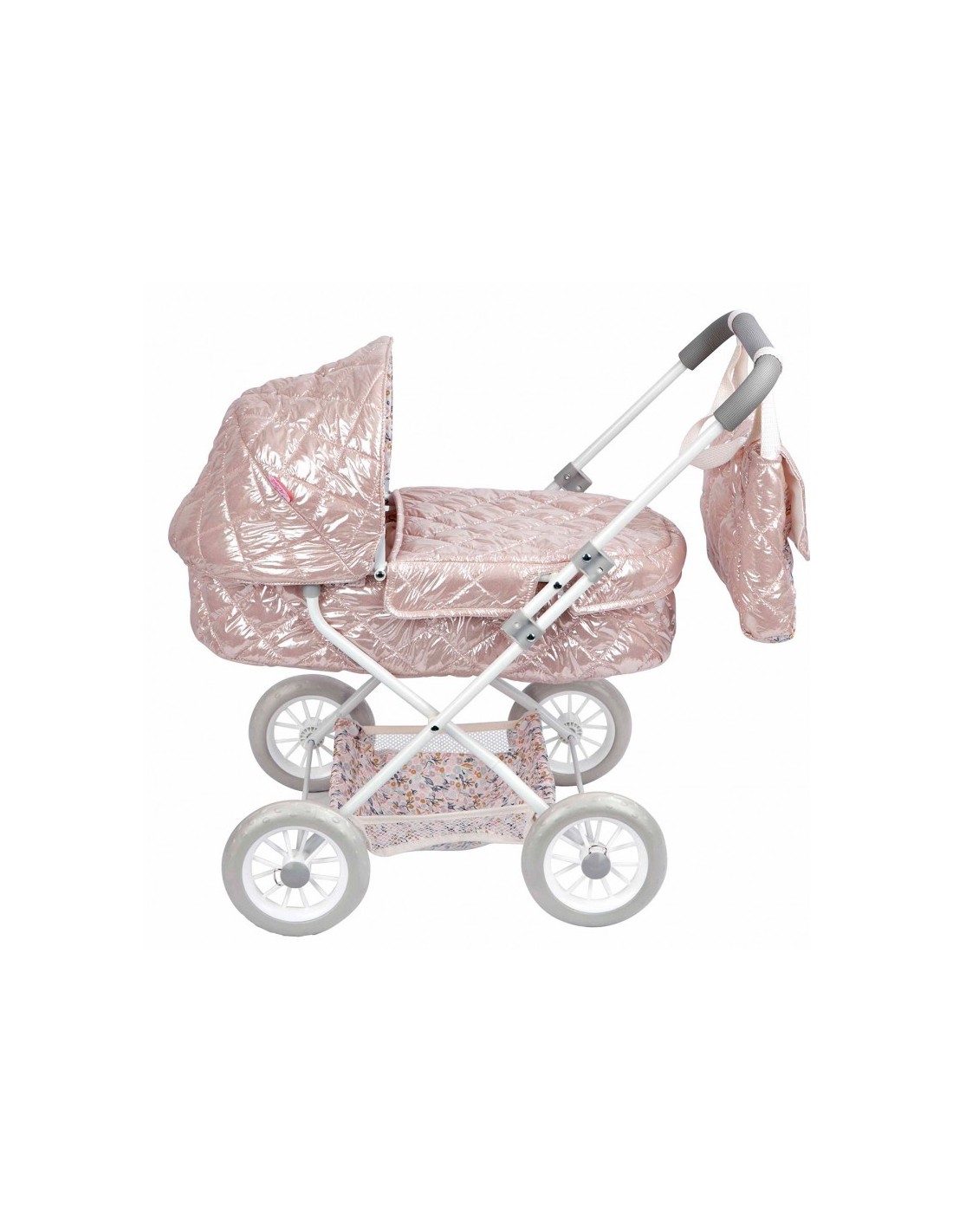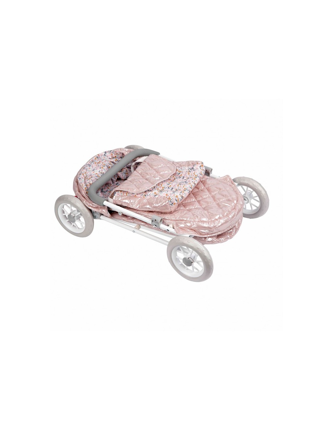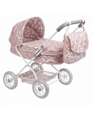 Wózek z budką z kolekcji FANTASY. Składany i ze zdejmowaną gondolą. Zawiera pasującą torbę, w której możesz przechowywać wszystkie akcesoria. Wysokość kierownicy wynosi 55 cm. Ten wózek spacerowy z jasnoróżowej wyściełanej tkaniny i motywami kwiatowymi jest idealny na spacer po parku z ulubioną lalką.