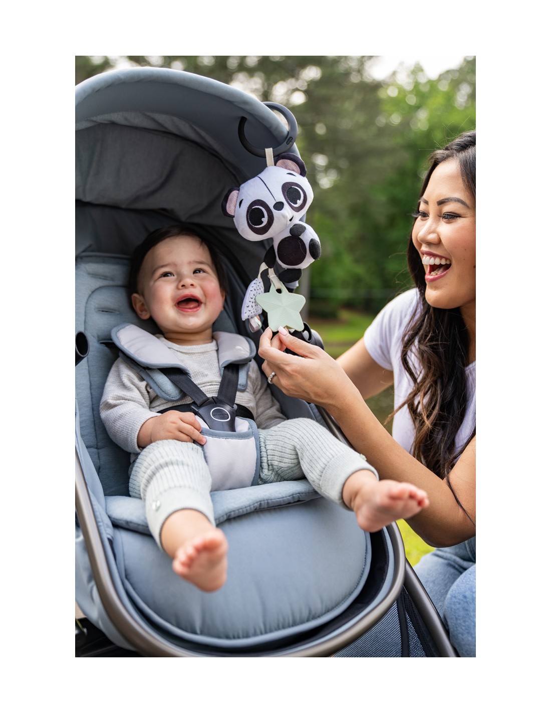 PRZYTULNY I UROCZY: Pierścień, za pomocą którego można przymocować zabawkę do fotelika czy wózka, pozwala na zabranie jej w podróż, dzięki temu Panda może być z maluchem wszędzie, zapewniając mu poczucie bezpieczeństwa.