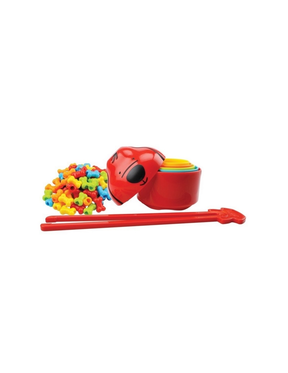W zestawie znajduje się kilka pojemników w różnych kolorach i różnej wielkości, szczypce i kolorowe kosteczki z otworkami. Zabawka zachęca dziecko do korzystania z pałeczek by chwycić kosteczki i posegregować je do kolorowych miseczek, tak jak można zrobić to za pomocą dwóch paluszków.