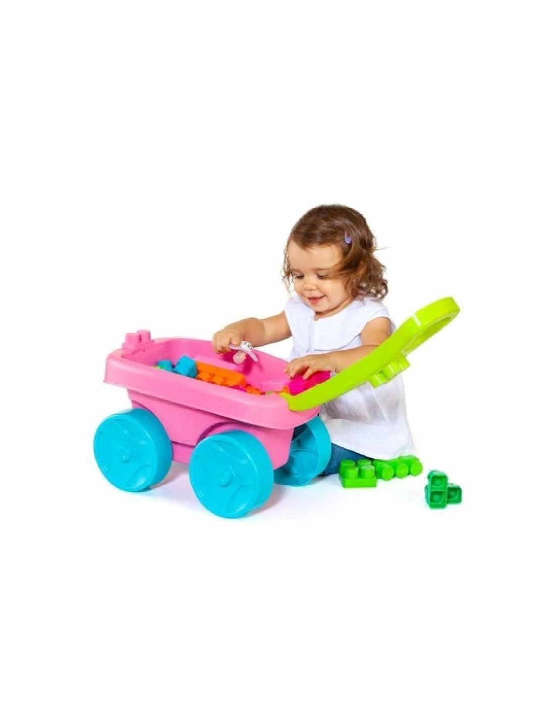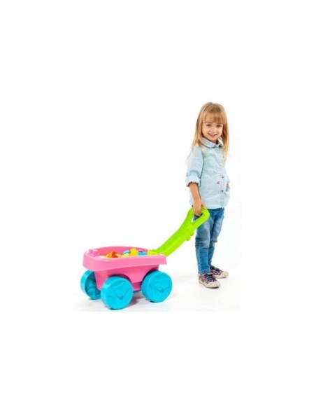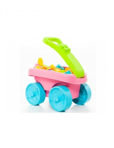 Wózek zawiera 20 dużych elementów konstrukcyjnych w różnych kolorach, dzięki czemu maluch może bawić się, przewozić i składać wszystkie elementy konstrukcyjne.