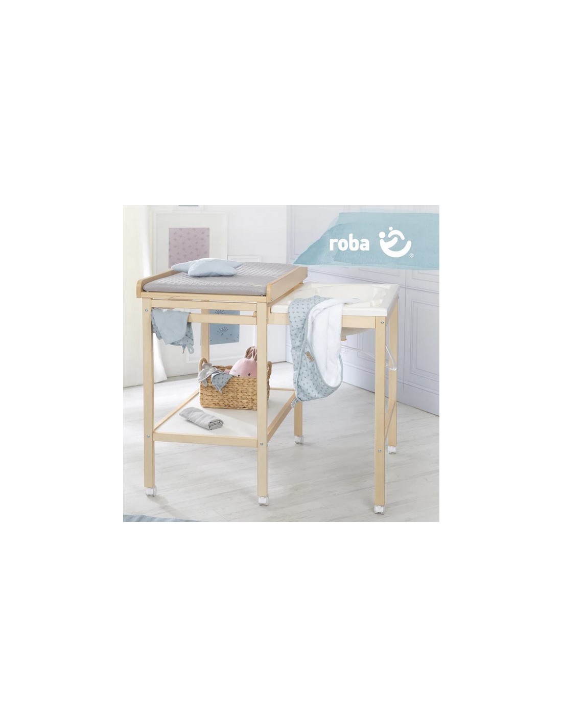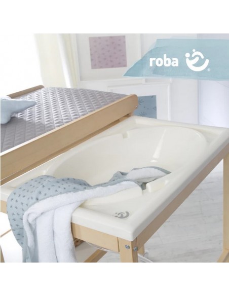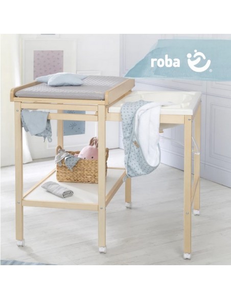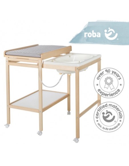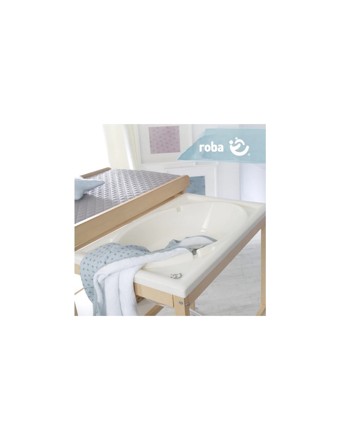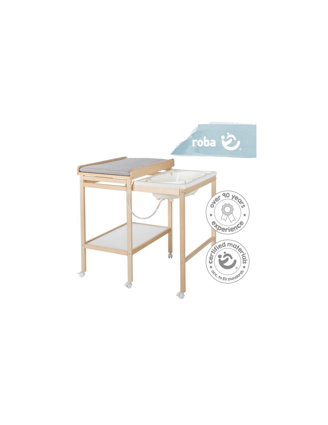 Kombinacja do przewijania "Baby Pool" firmy roba wraz z matą do przewijania w nowoczesnym stylu "roba" zajmuje niewiele miejsca i jest praktyczna dzięki swoim niewielkim wymiarom. Przewijak wykonany z lakierowanego drewna pasuje do każdego wnętrza dzięki prostemu wzornictwu. Jednym ruchem nadgarstka można go przekształcić z przewijaka w stanowisko do kąpieli dziecka. Zintegrowaną wanienkę można bez wysiłku wysunąć dzięki kółkom i wsunąć z powrotem pod przewijak, aby zaoszczędzić miejsce. Wygodna wysokość przewijania wynosząca 93,5 cm sprawia, że opieka nad dzieckiem jest przyjemnością dla rodziców i dziecka. Wąż odpływowy ułatwia spuszczanie wody z wanienki bez konieczności jej przesuwania. Ponadto wanienka i przewijak są wyposażone w 6 kółek z hamulcem ułatwiających przemieszczanie oraz schowek na wszystkie niezbędne przybory do pielęgnacji. Mata do przewijania "roba style" jest miękko wyściełana, dzięki czemu dziecko leży wygodnie. Materiał wierzchni maty do przewijania z powłoką odporną na wodę i zabrudzenia jest wyjątkowo przyjazny dla skóry i miły w dotyku. Wysokiej jakości, nowoczesna seria "roba Style" oferuje produkty dla niemowląt wykonane z łatwej w pielęgnacji, pikowanej mikrofibry. Produkty "roba Style" zachwycają modnym wyglądem, który pasuje do każdego salonu i pokoju dziecięcego, oraz przyjemną miękkością w dotyku. Zestaw do przewijania roba został opracowany w Niemczech i jest zgodny z aktualnymi standardami bezpieczeństwa zgodnie z normą EN 12221-1+2:2008+A1:2013. Wszystkie materiały użyte w zestawie do przewijania są testowane pod kątem szkodliwych substancji, certyfikowane i regularnie testowane. Powierzchnia maty do przewijania jest zmywalna i łatwa do czyszczenia. Materiał maty do przewijania: mikrofibra. Wypełnienie: włóknina poliestrowa. Kolor: Szary, Kolekcja: 'roba Style'. Połączenie wanienki i przewijaka: wys. x szer. x gł.: 99 x 57,5 x 82,5 cm, szerokość po wyciągnięciu wanienki: 98,5 cm, wysokość przewijaka: 93,5 cm, powierzchnia przewijaka: 82,5 x 51 cm, kolor: dwukolorowy, może być używany do 12 miesięcy lub 11 kg wagi ciała.