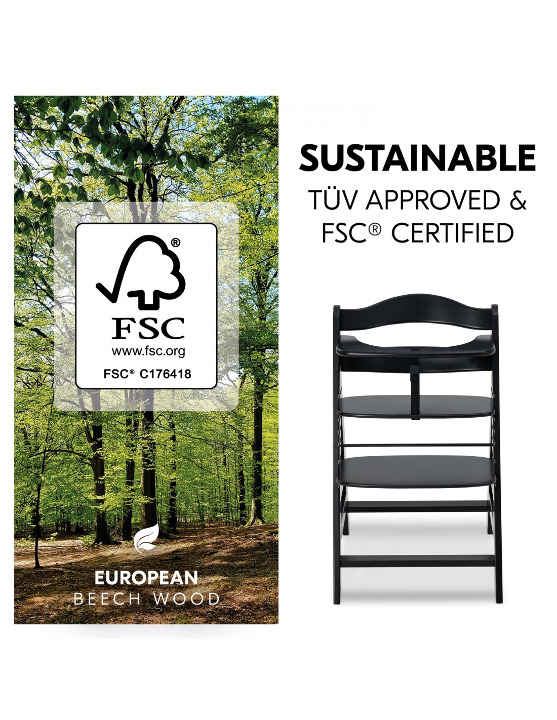 Hauck wnosi swój wkład w ochronę środowiska dzięki drewnianemu krzesełku Alpha+. Przetworzone drewno pochodzi z ekologicznych europejskich upraw drzew bukowych.