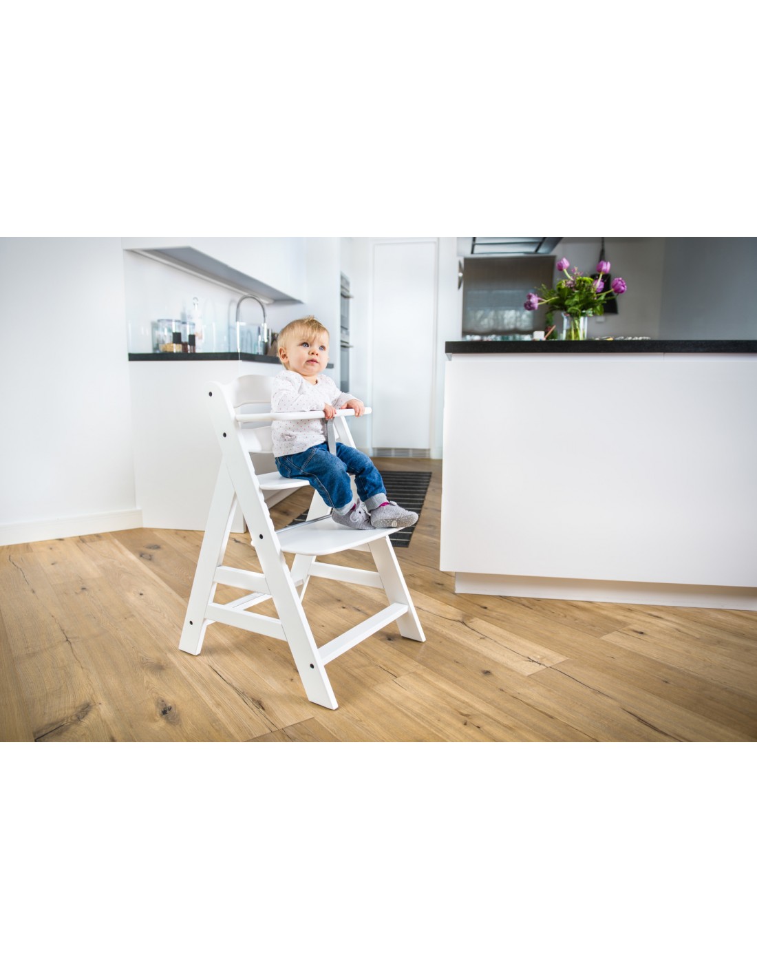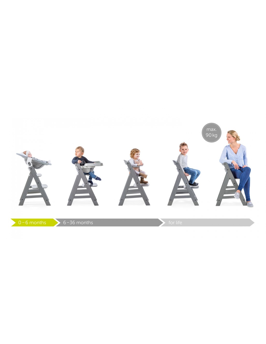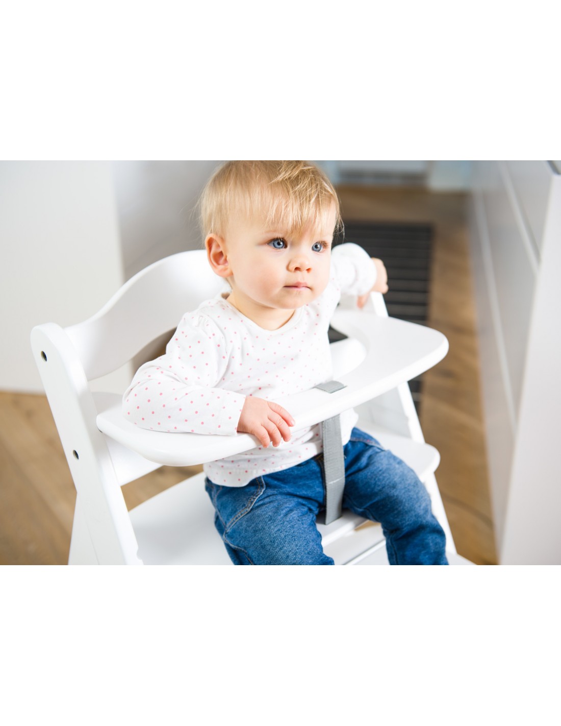 Wysokość i głębokość siedzenia oraz podpórki na nogi mogą być regulowane i dostosowywane do wieku dziecka. Uchwyt z przodu oraz 5-punktowy układ pasów są mocowane z tyłu za pomocą rzepów i mogą być dostosowywane do wielkości dziecka. Taśmy chroniące krocze montowane są w równie prosty sposób. Pasy można stosować w zależności od potrzeb. W ten sposób dziecko możne towarzyszyć Wam w posiłkach już od 6-go miesiąca życia. 5-punktowy system pasów jest mocowany z tyłu za pomocą rzepów i może być dostosowywany do wielkości dziecka. Taśmy chroniące krocze montowane są w równie prosty sposób. Pasy można stosować w zależności od potrzeb.