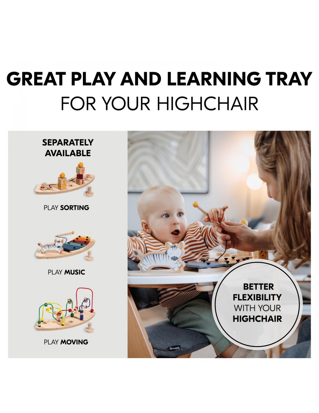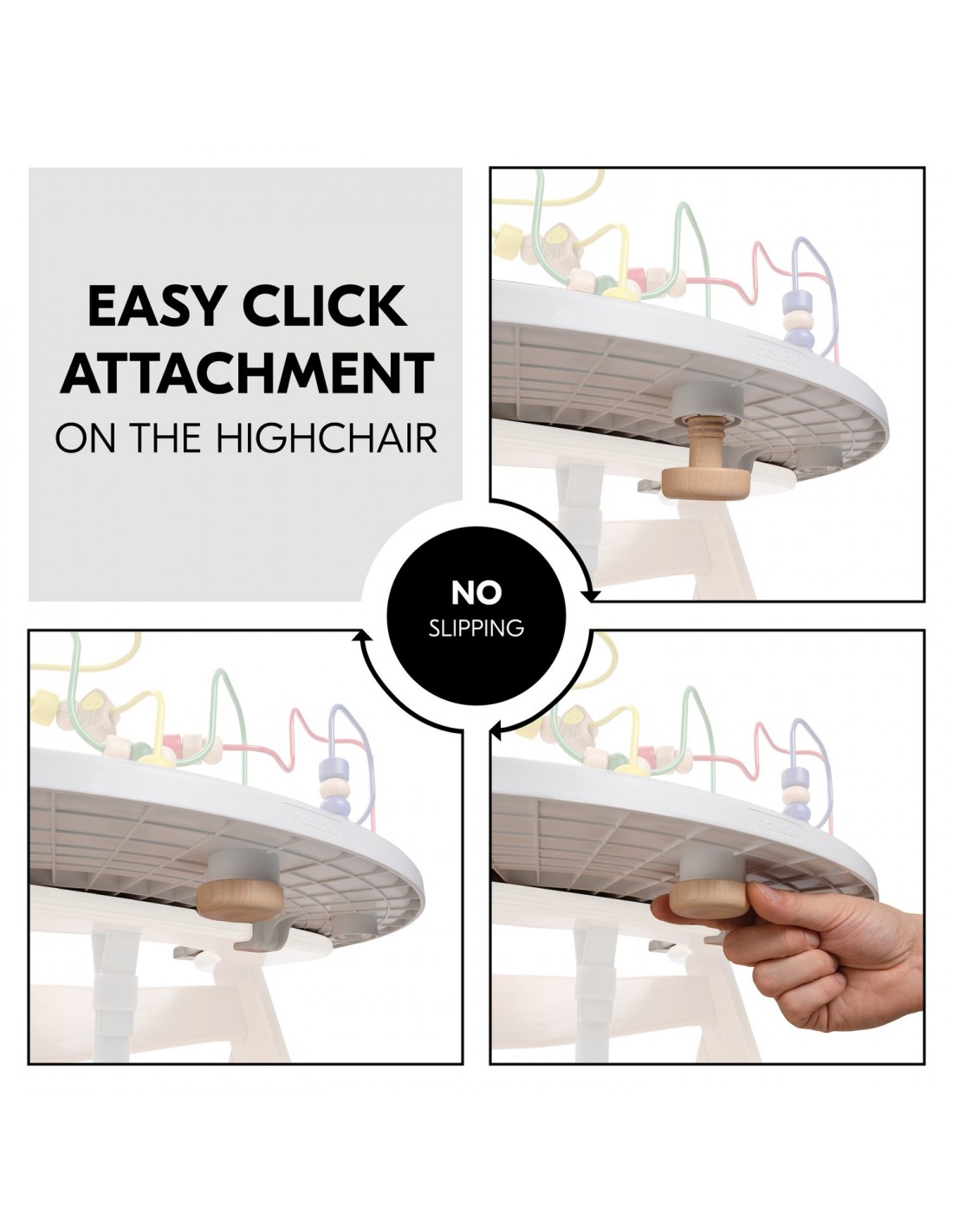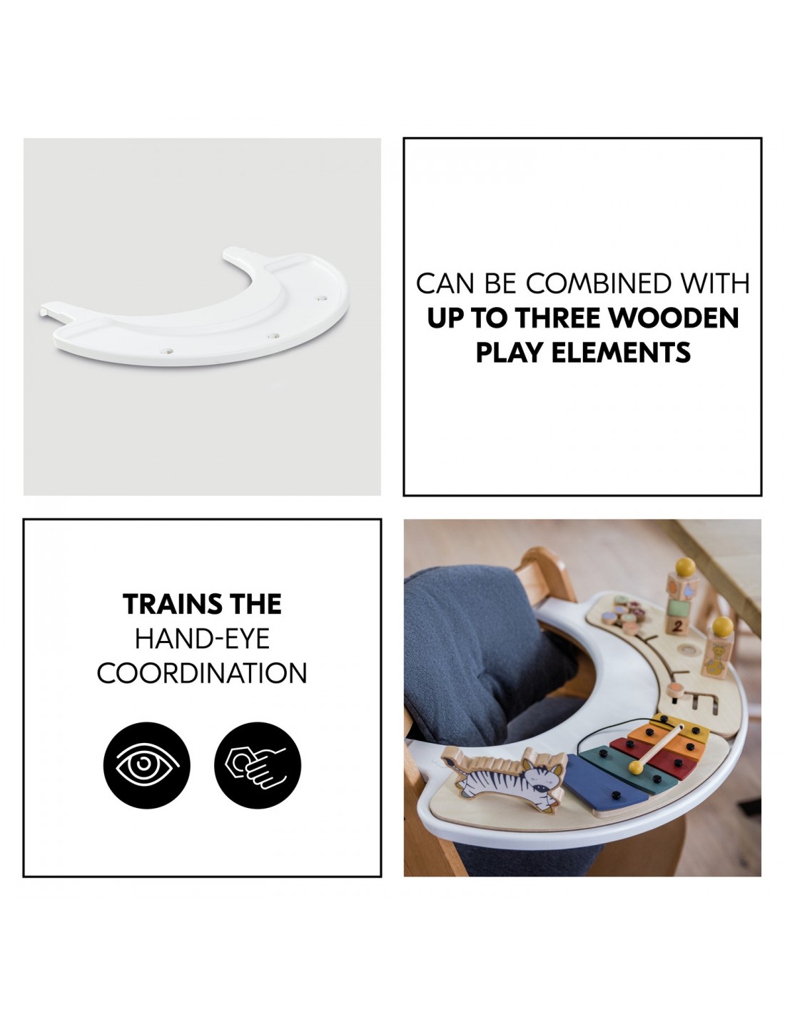 gdy nie jest już potrzebna. Dostępne oddzielnie akcesoria do zabawy można łatwo przymocować do tacki za pomocą drewnianej śruby. Oznacza to, że nic nie może ześlizgnąć się lub spaść na podłogę podczas zabawy. Tacka do zabawy może być używana razem z 5-punktowymi szelkami i pasem krokowym dzięki czemu dziecko jest bezpiecznie usadowione również podczas zabawy. Odpowiednie od 6 miesiąca życia.
