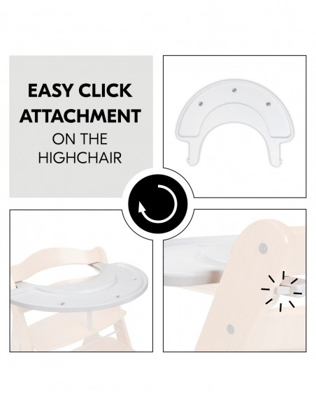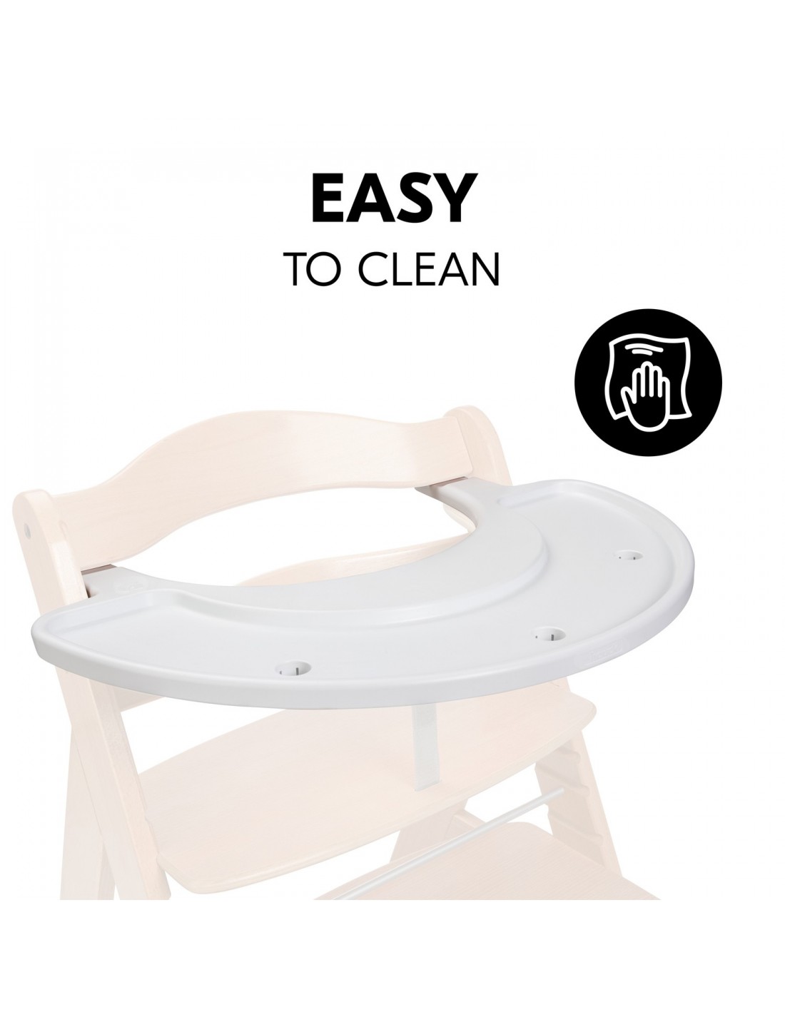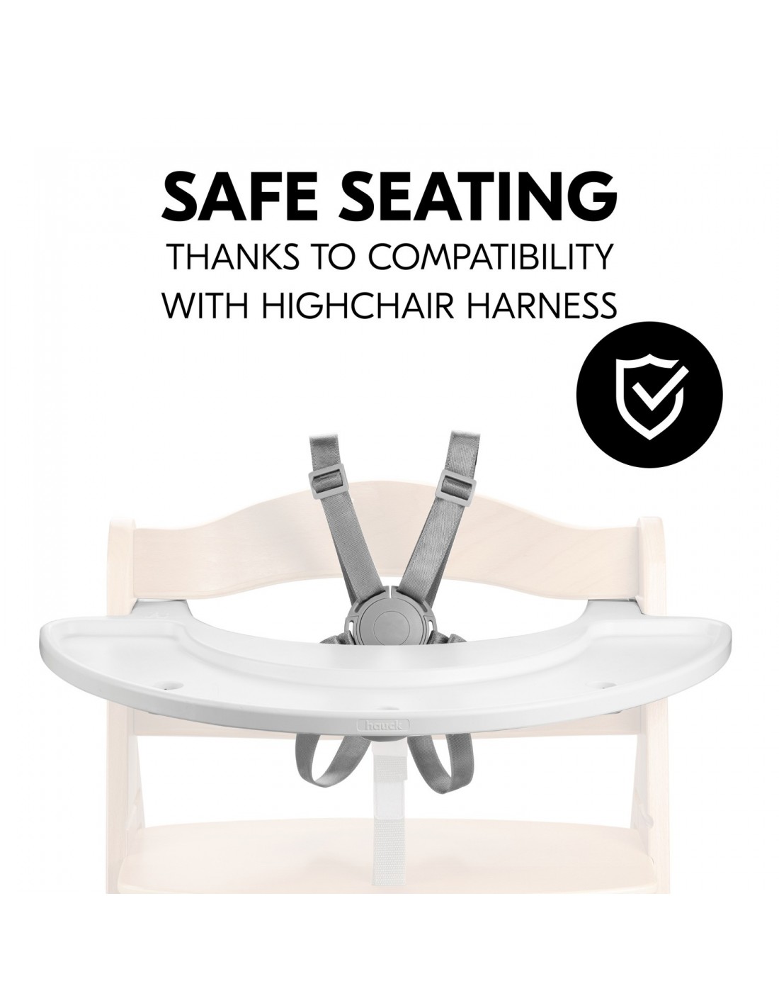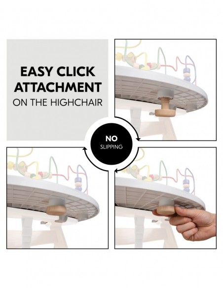 gdy nie jest już potrzebna. Dostępne oddzielnie akcesoria do zabawy można łatwo przymocować do tacki za pomocą drewnianej śruby. Oznacza to, że nic nie może ześlizgnąć się lub spaść na podłogę podczas zabawy. Tacka do zabawy może być używana razem z 5-punktowymi szelkami i pasem krokowym dzięki czemu dziecko jest bezpiecznie usadowione również podczas zabawy. Odpowiednie od 6 miesiąca życia.