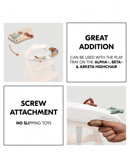 do tacki do zabawy krzesełka do karmienia Alpha+, Beta+ lub Arketa. Dzięki temu nic nie spadnie. Silikonowe części można zabrać wszędzie.