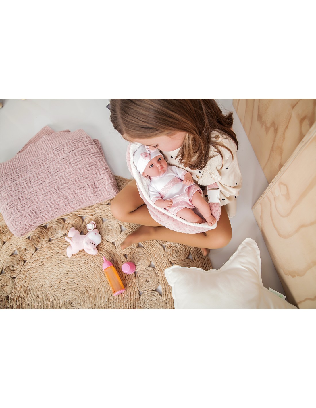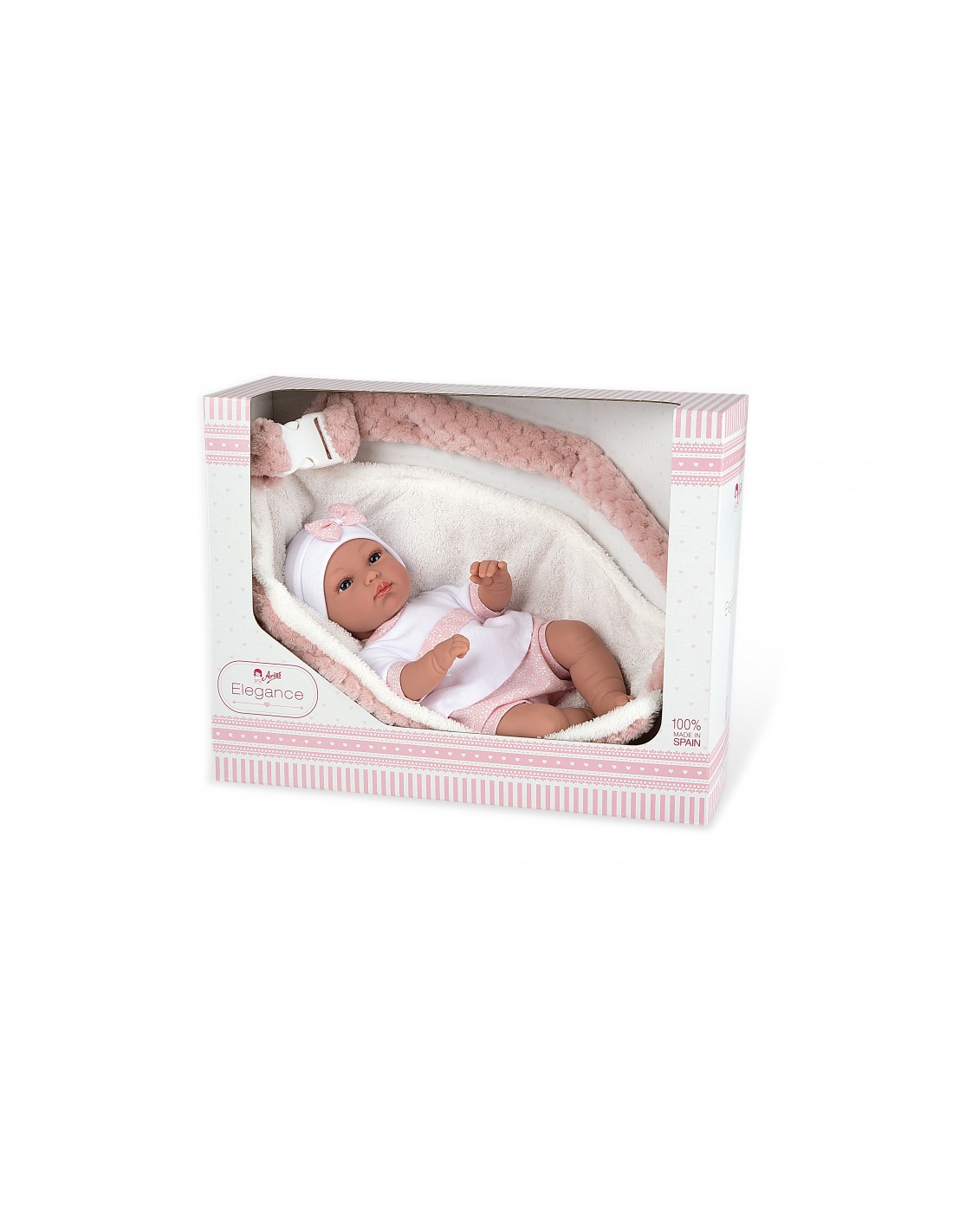 Ta słodka lalka będzie idealną towarzyszką przygód! Nosidełko jest bardzo lekkie i wygodne, dzięki czemu zawsze możesz je nosić przy sobie. Jest to niemowlę o miękkim ciele i winylowych kończynach, które są miękkie w dotyku o lekkim zapachu wanilii. Jej ubranka i nosidełko w odcieniach różu i bieli wykonane są z wysokiej jakości materiałów. Poza tym będzie potrzebowała dużo przytulania, bo jeśli ściśniesz jego brzuszek, będzie płakała. Zawiera smoczek i nosidełko jako akcesoria.