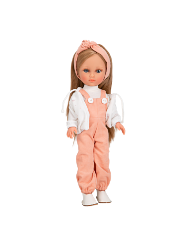 Śliczna laleczka z długimi włosami w kolorze blond. Jej ciało jest bardzo miękkie, wykonane z winylu. Ubrana jest w ogrodniczki w kolorze łososiowym, kurtkę z nadrukiem, t-shirt i białe buty. Jej ubranie w neutralnych odcieniach zostało zaprojektowane z niezwykłą starannością i wykonane z wysokiej jakości materiałów. W zestawie z opaską do włosów.