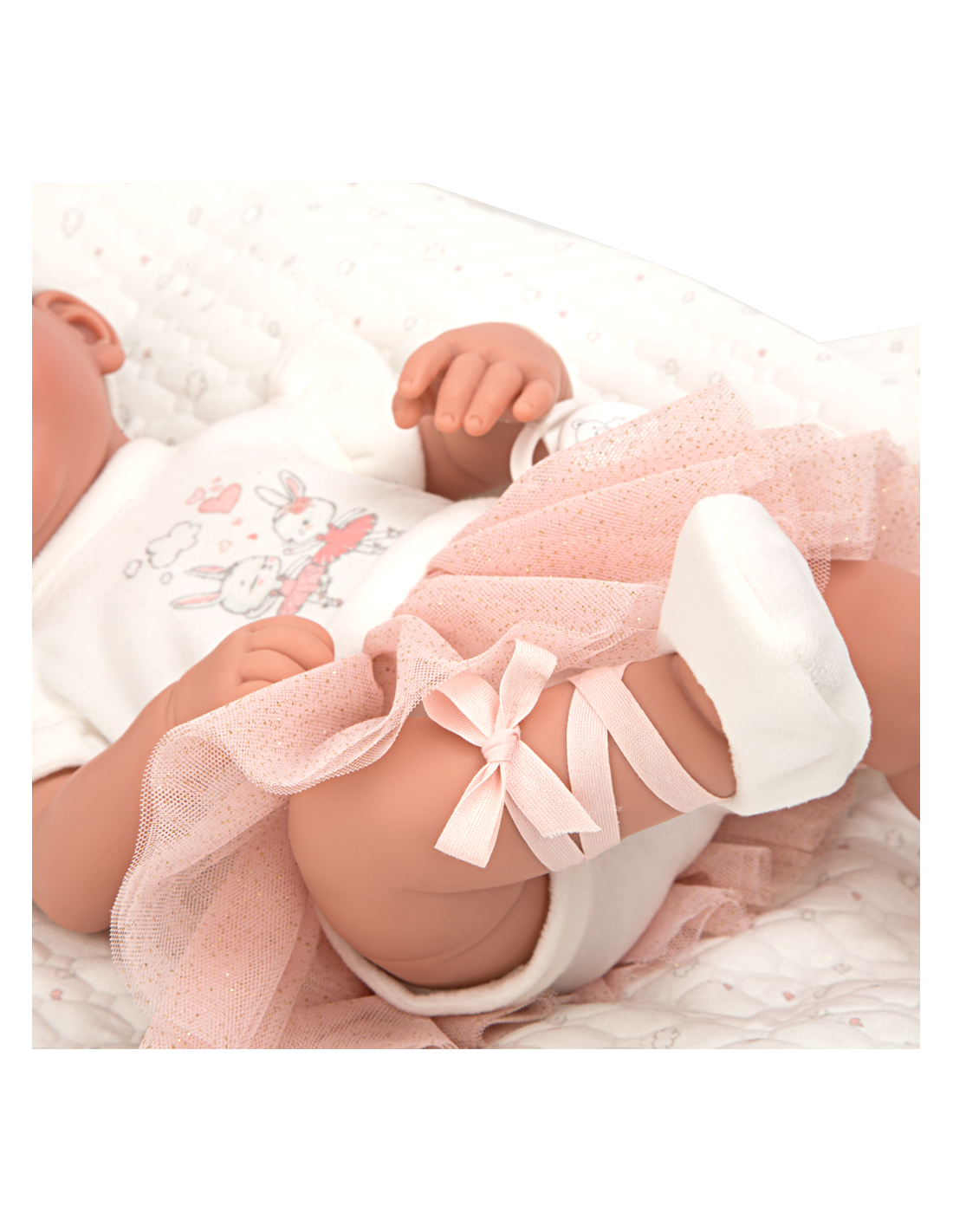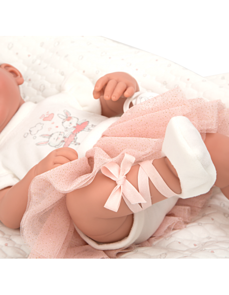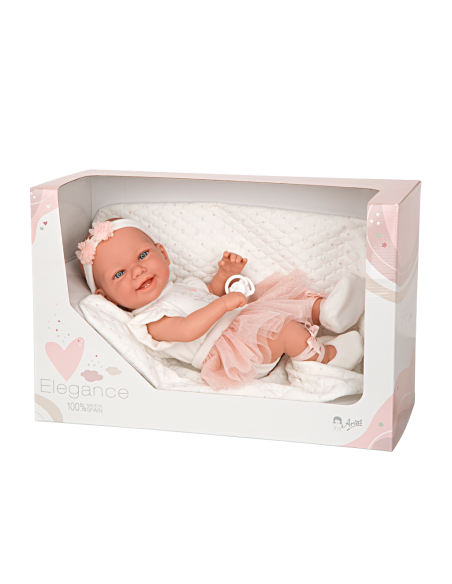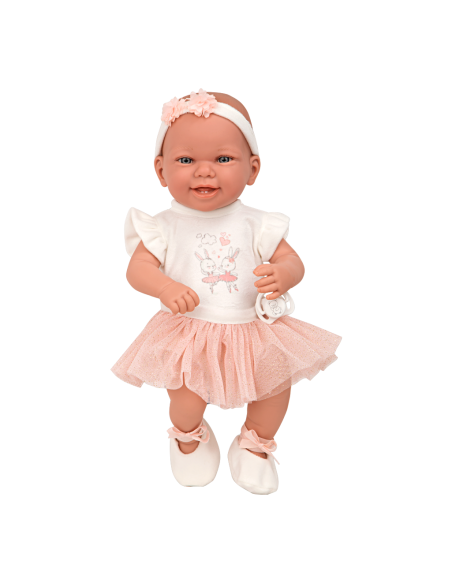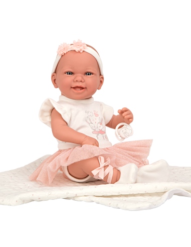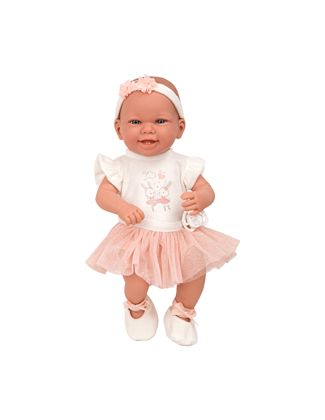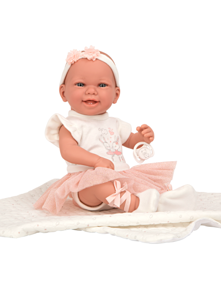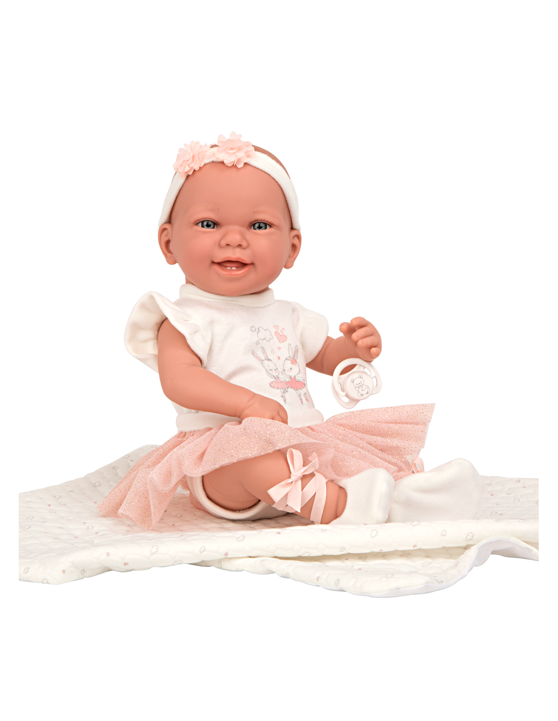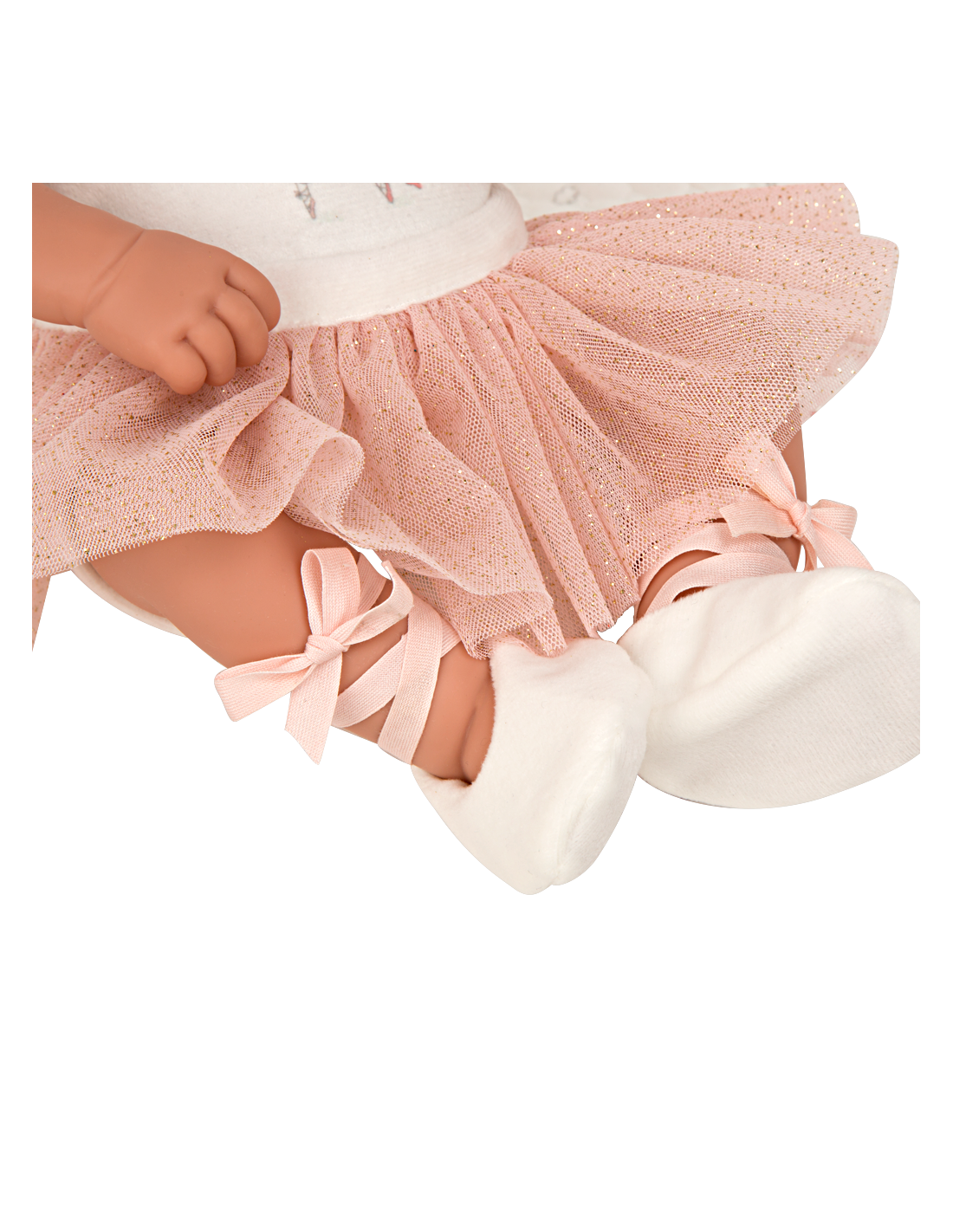 Śliczna laleczka baletnica. Jej ciało jest bardzo miękkie, wykonane z winylu. Ubrana jest w różowo-biały strój baletnicy z zabawnym zwierzęcym wzorem na koszulce. Jej ubranie w neutralnych odcieniach zostało zaprojektowane z niezwykłą starannością i wykonane z wysokiej jakości materiałów. W zestawie ze smoczkiem i kocykiem.