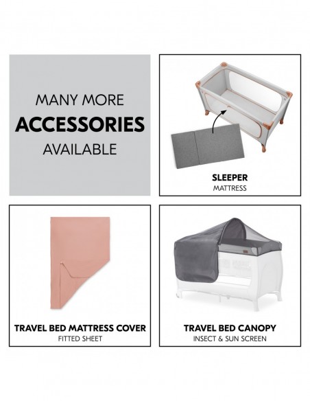 Łóżko uzupełnia materac Sleeper, chroniący przed owadami i słońcem baldachim Travel Bed Canopy, prześcieradło Travel Bed Mattress Cover oraz prześcieradło Travel Bed Cover.