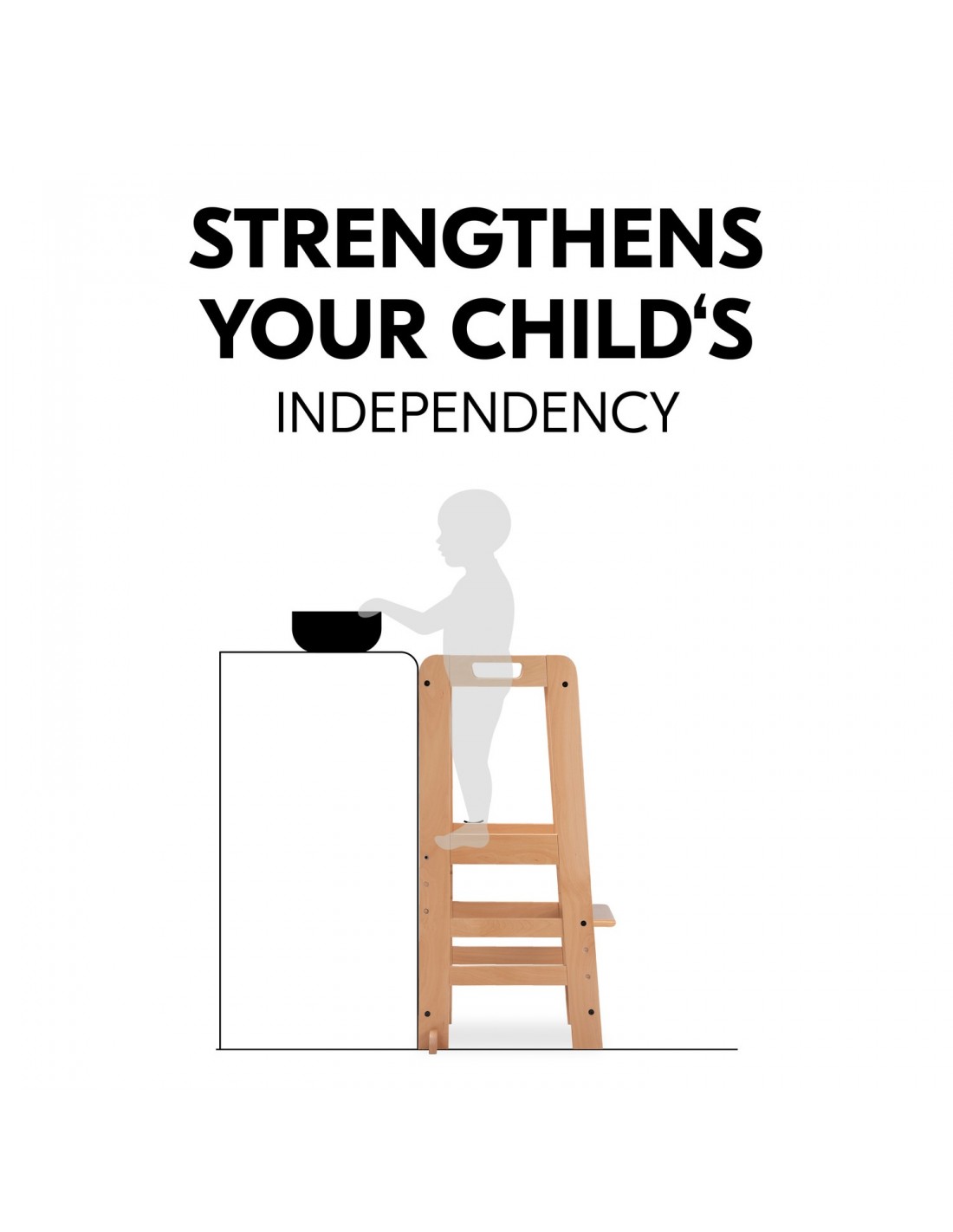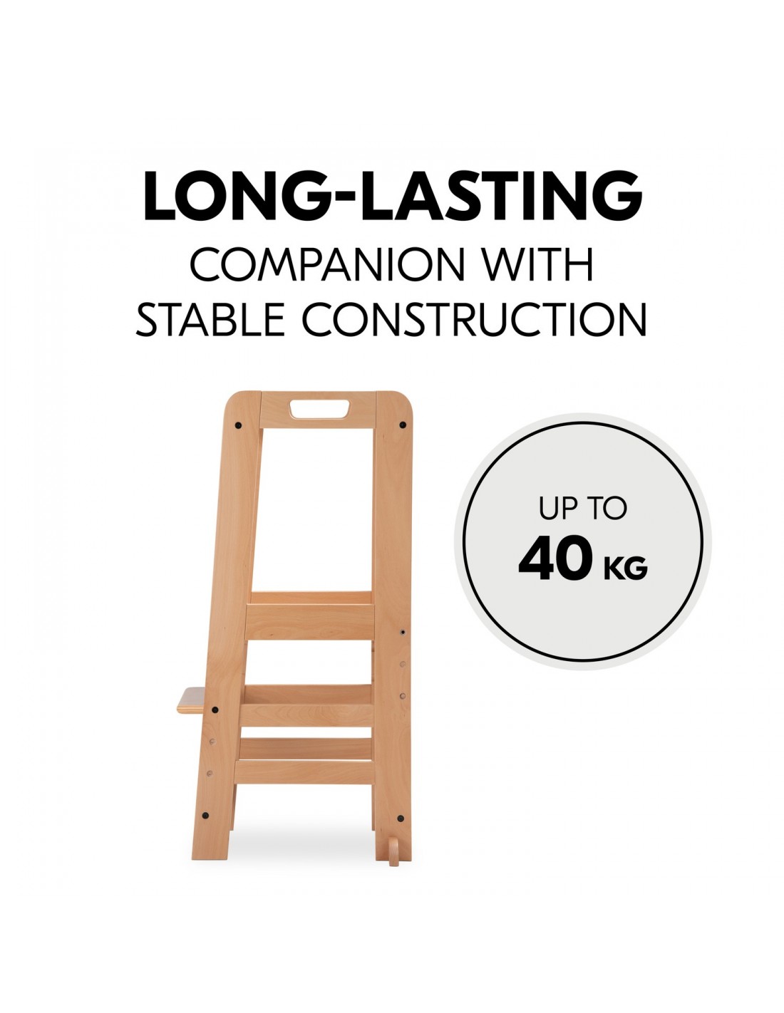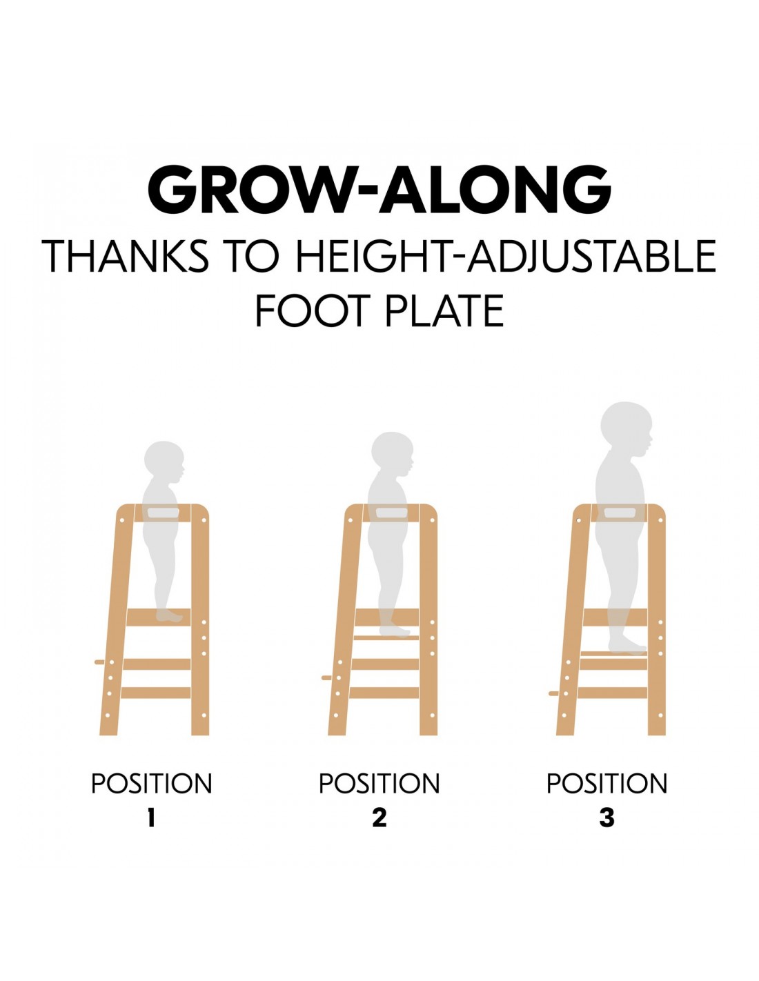 W zależności od wzrostu dziecka można regulować stopień i główną podstawę na trzech różnych wysokościach - 33, 39 i 45 cm. Solidna konstrukcja pozwala dziecku korzystać z wieży do 40 kg, zarówno w kuchni, przy stole jadalnym, jak i przy umywalce w łazience.
