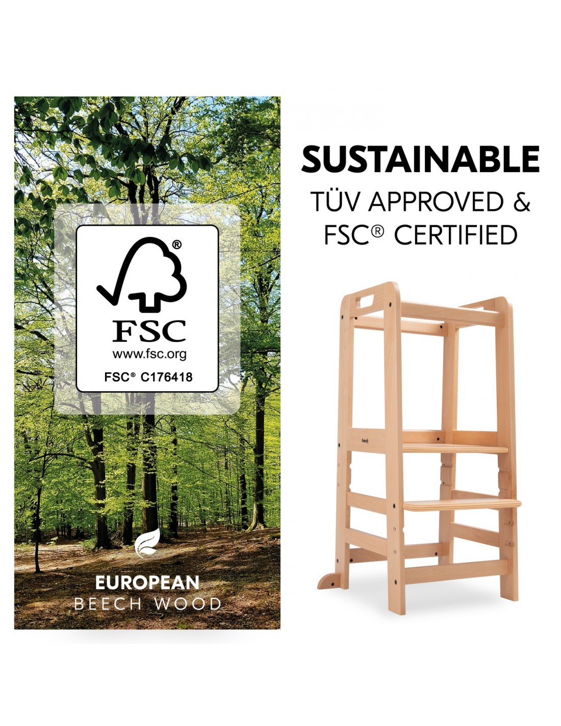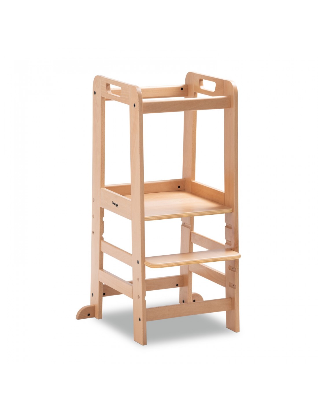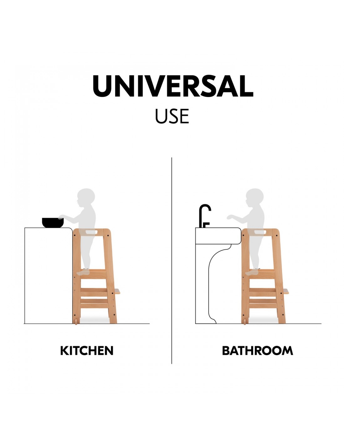 W zależności od wzrostu dziecka można regulować stopień i główną podstawę na trzech różnych wysokościach - 33, 39 i 45 cm. Solidna konstrukcja pozwala dziecku korzystać z wieży do 40 kg, zarówno w kuchni, przy stole jadalnym, jak i przy umywalce w łazience.