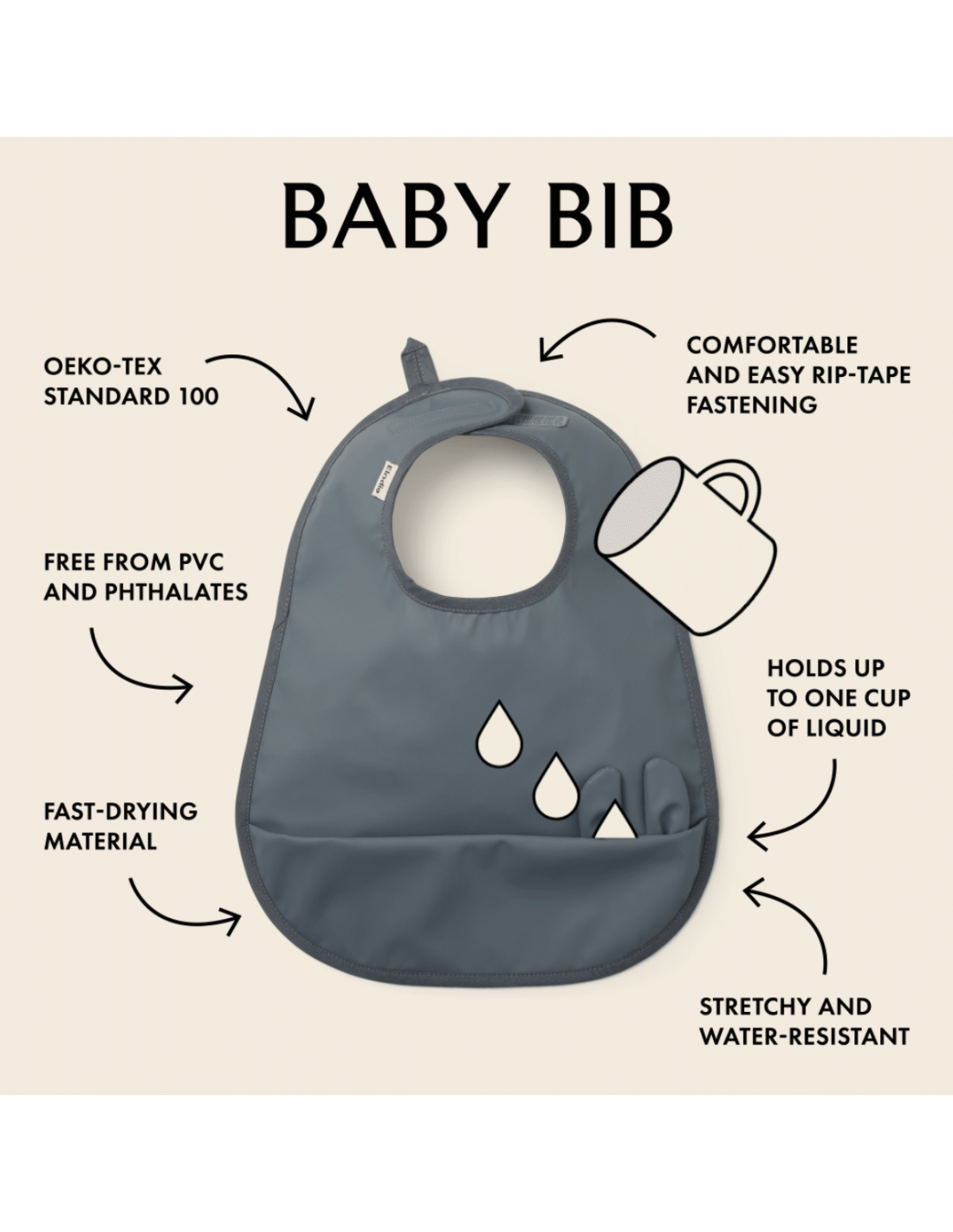 Stylowy śliniaczek szwedzkiej firmy Elodie Details, wyposażony w kieszonkę z przodu, zapewnia porządek i komfort w trakcie karmienia dziecka. Wykonane z szybkoschnącego materiału posiadającego certyfikat Oeko-Tex, całkowicie wolny od polichlorku winylu (PVC-free), idealne dopasowanie do potrzeb każdego dziecka. Śliniaczki wystarczy przetrzeć lub umyć po każdym użyciu i odczekać kilka minut aż wyschną. Śliniaczki są zapinane na duży miękki rzep. To produkt praktyczny i przyjazny dla środowiska.