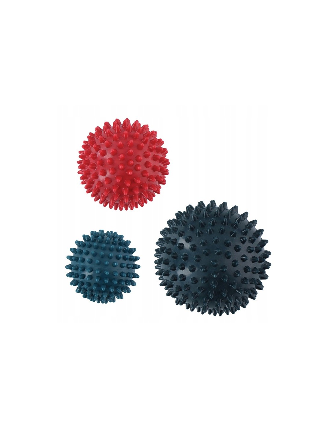 Zestaw piłeczek rehabilitacyjno-relaksacyjnych z kolcami (różne rozmiary) służą do poprawienia krążenia krwi, masażu obolałych lub zmęczonych mięśni oraz obniżenia stresu.