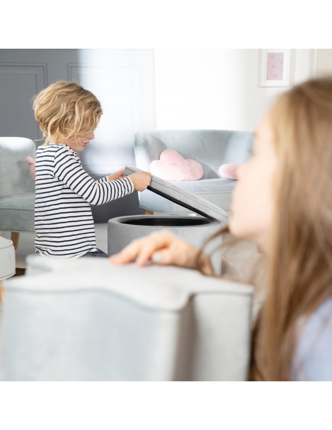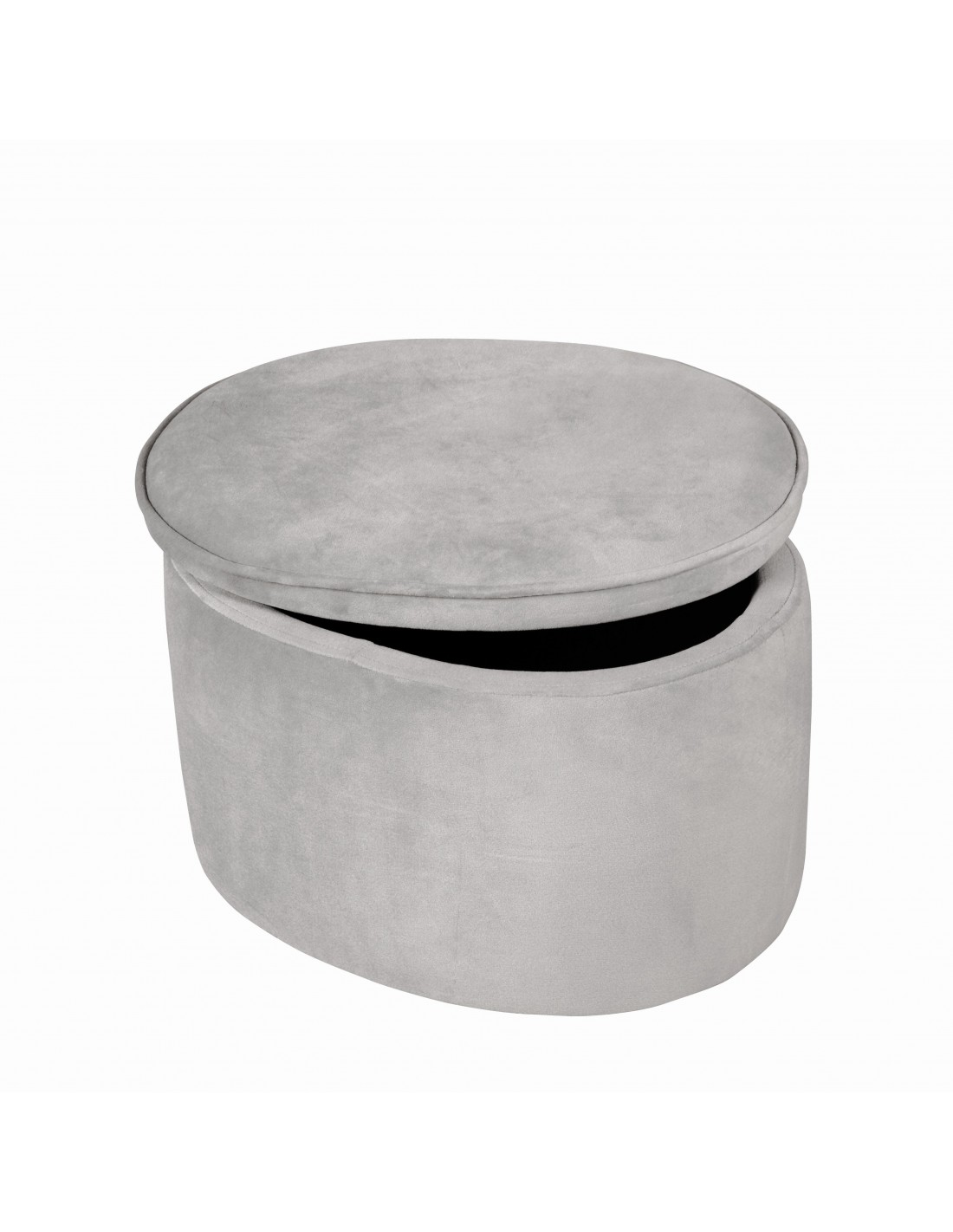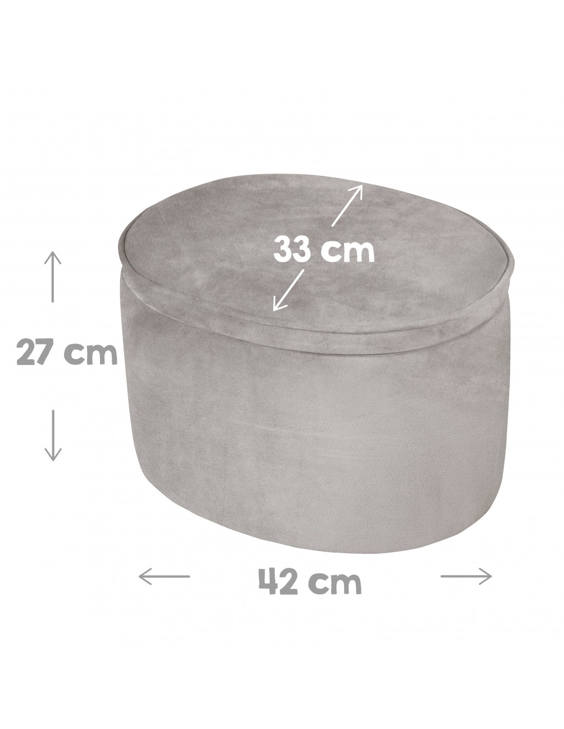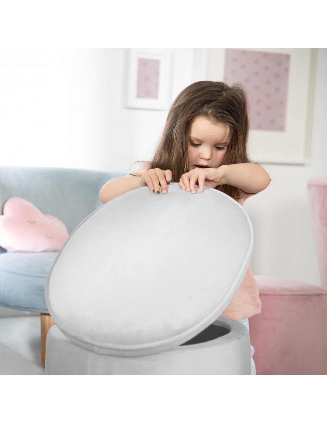 Owalny taboret dziecięcy Roba z funkcją przechowywania to praktyczny mebel do siedzenia w pokoju dziecięcym lub niemowlęcym. Pod zdejmowaną pokrywą taboret dziecięcy oferuje dodatkowe miejsce do przechowywania dziecięcych zabawek lub materiałów do malowania. Taboret z owalnym siedziskiem jest dostępny w nowoczesnych kolorach szarym, różowym lub błękitnym. Miękko tapicerowana pufa siedziska pokryta jest aksamitną tkaniną, która zachwyca miękką powierzchnią.