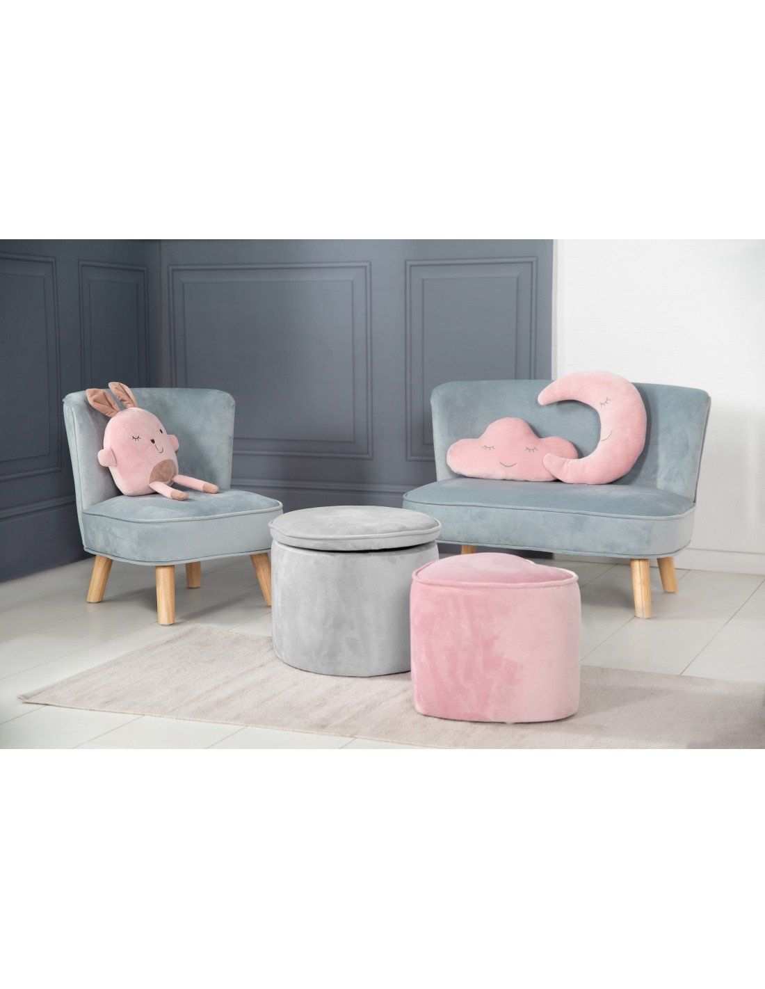 Do taboretu dziecięcego roba z funkcją przechowywania dostępne są inne meble do siedzenia dla dzieci z serii "Lil Sofa", takie jak sofa dziecięca, fotel dziecięcy, taboret w kształcie serca i taboret w kształcie gwiazdy, każdy w nowoczesnych kolorach szarym, różowym lub błękitnym.