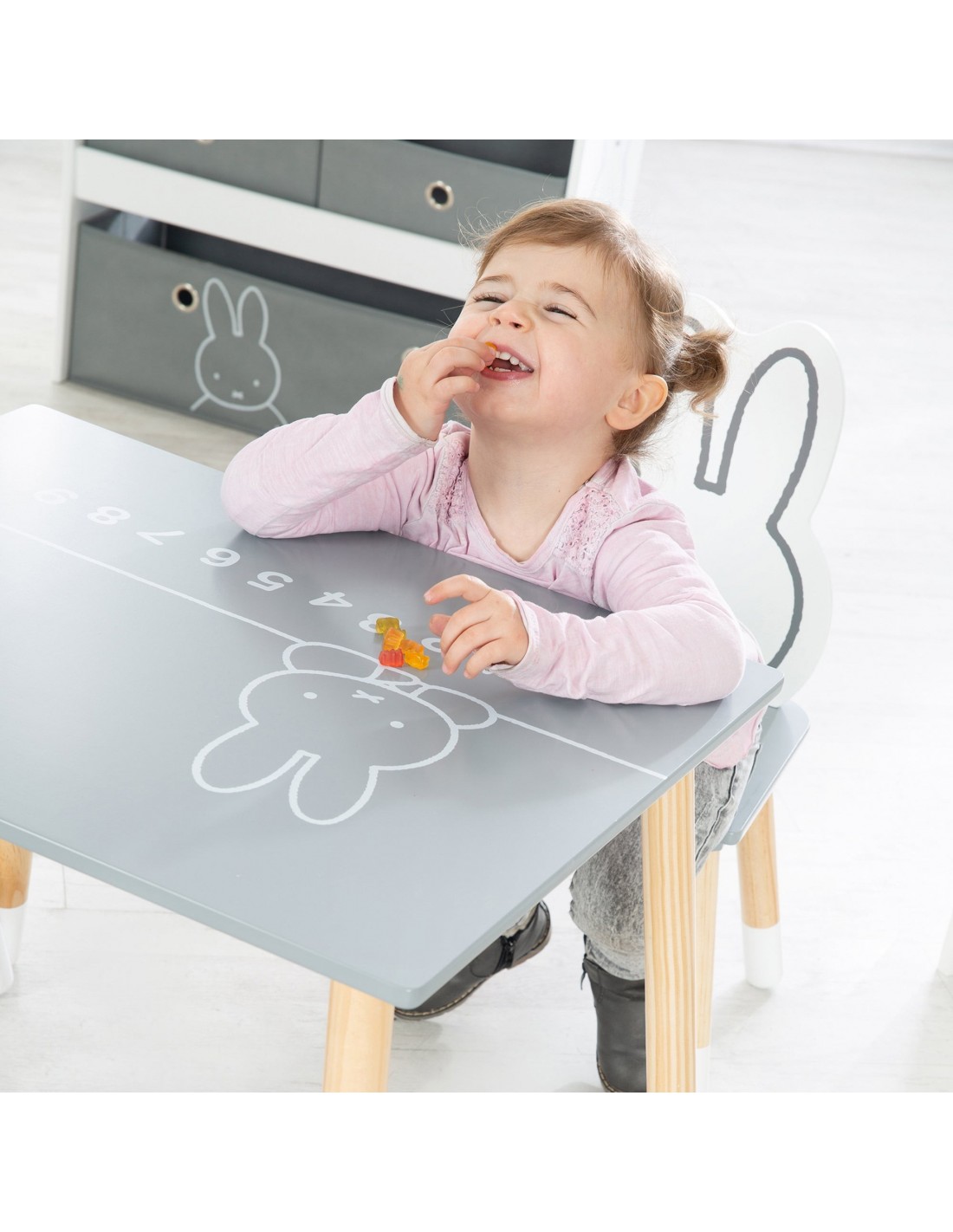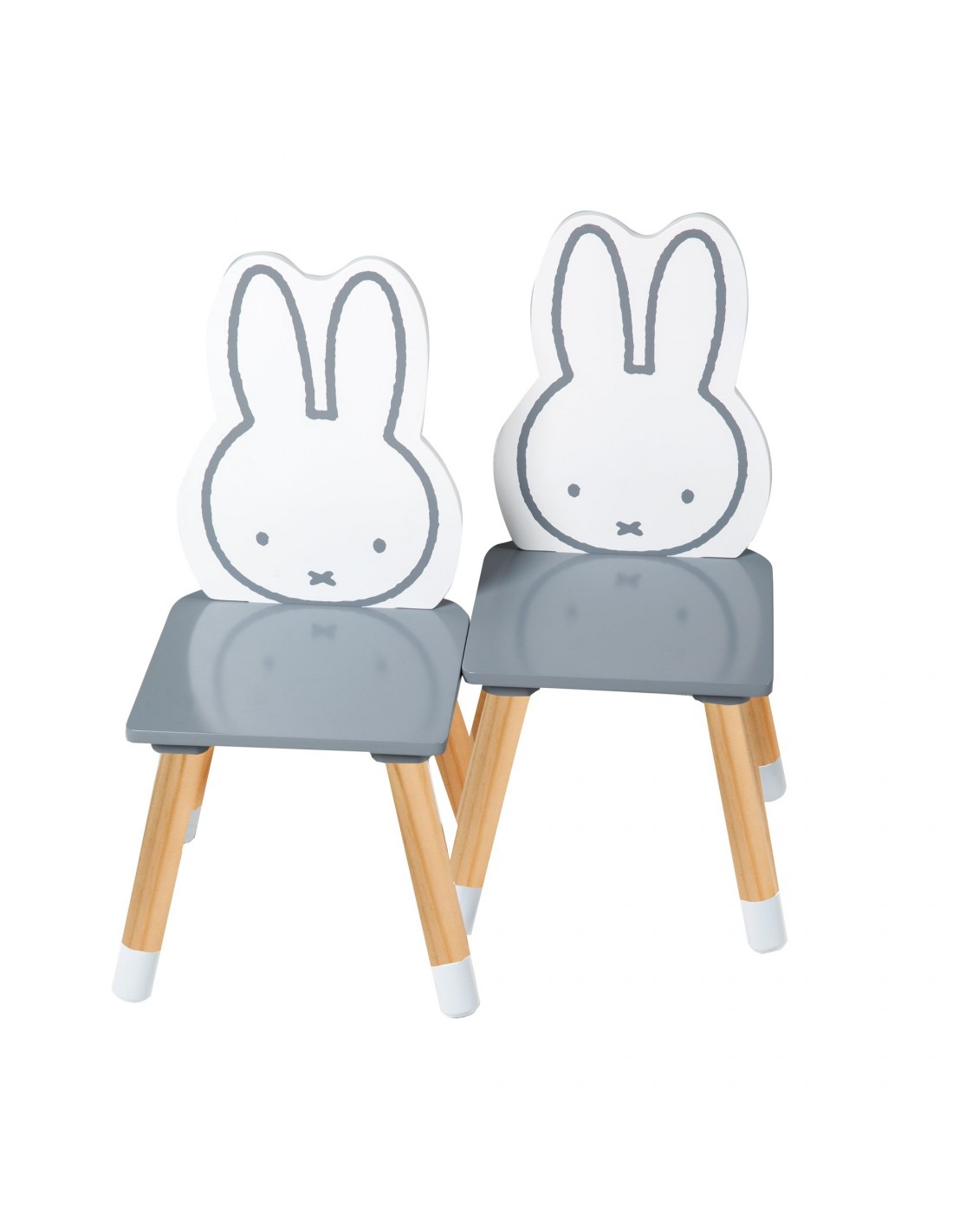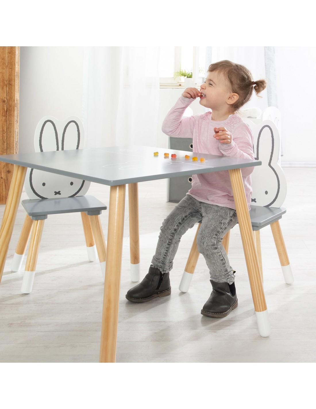 3-częściowy zestaw mebli dziecięcych „miffy®” inspiruje nie tylko fanów miffy®. Składa się z eleganckiego stolika dziecięcego i dwóch pasujących do niego krzeseł. Siedziska krzesełek dziecięcych i blat pomalowane są na kolor ciemnoszary. Blat stołu jest również ozdobiony uroczą twarzą miffy® i cyframi od 0 do 9. Najważniejszym elementem zestawu mebli dla dzieci są oparcia krzeseł w kształcie miffy® i przedstawione na nich czarujące twarze miffy®. Twoje dziecko może już od najmłodszych lat wygodnie siedzieć przy stole, jeść, bawić się i wykonywać prace ręczne z zestawem do siedzenia dla dzieci roba. Zestaw wypoczynkowy został opracowany zgodnie z najnowszymi normami bezpieczeństwa obowiązującymi w Niemczech. Wszystkie materiały zostały przebadane pod kątem substancji szkodliwych i posiadają certyfikaty. Grupa siedzisk dziecięcych Roba Miffy® wykonana z lakierowanej płyty MDF jest idealnie dostosowana do potrzeb dzieci w wieku od 1,5 do 10 lat. Grupa krzeseł dziecięcych miffy® składa się z: dwóch krzeseł i stołu.