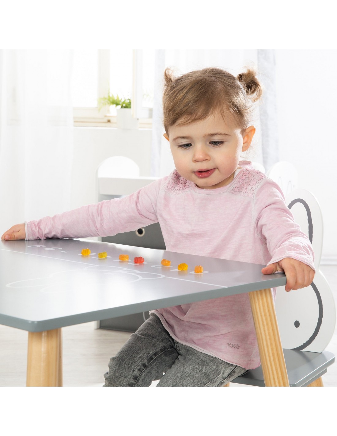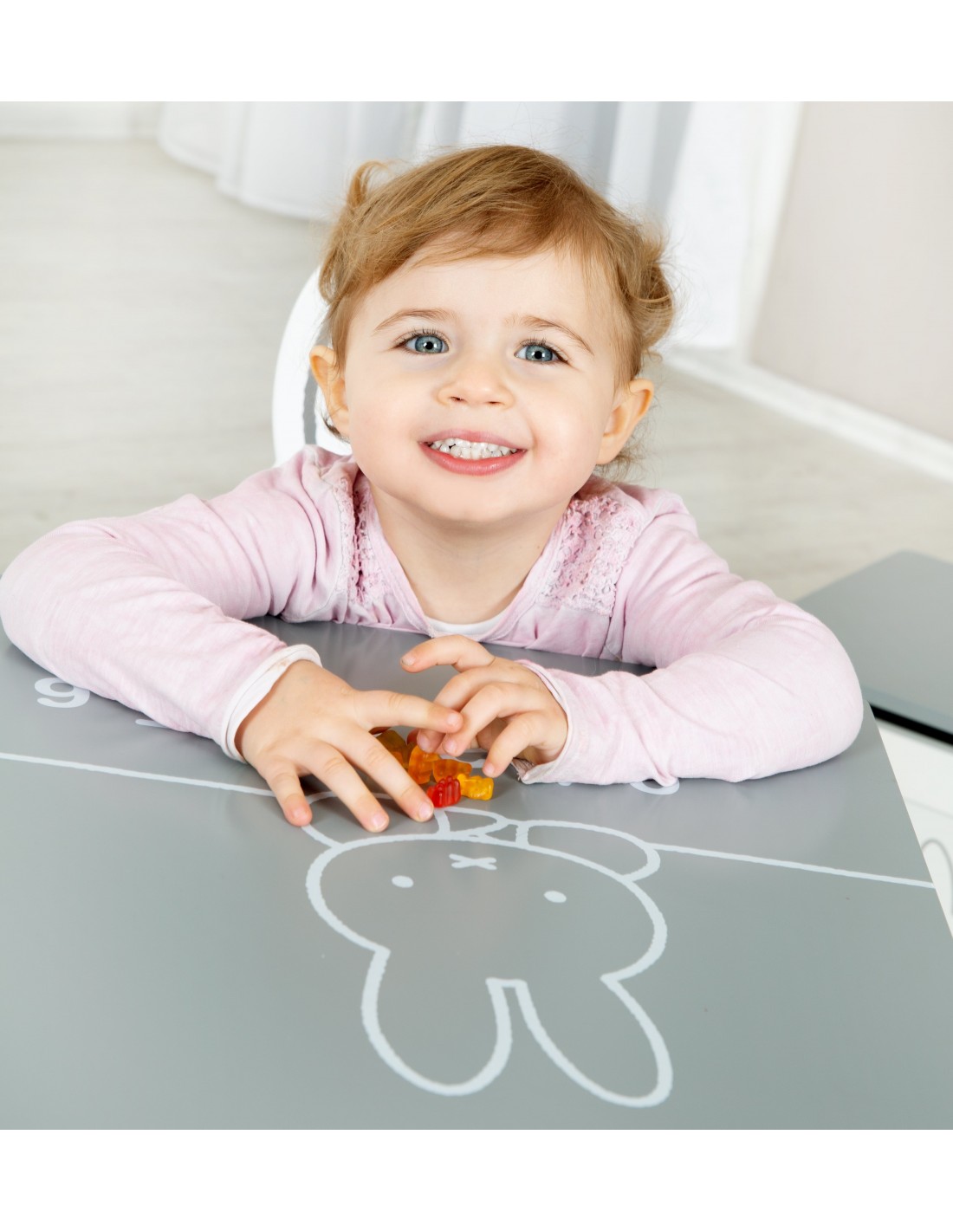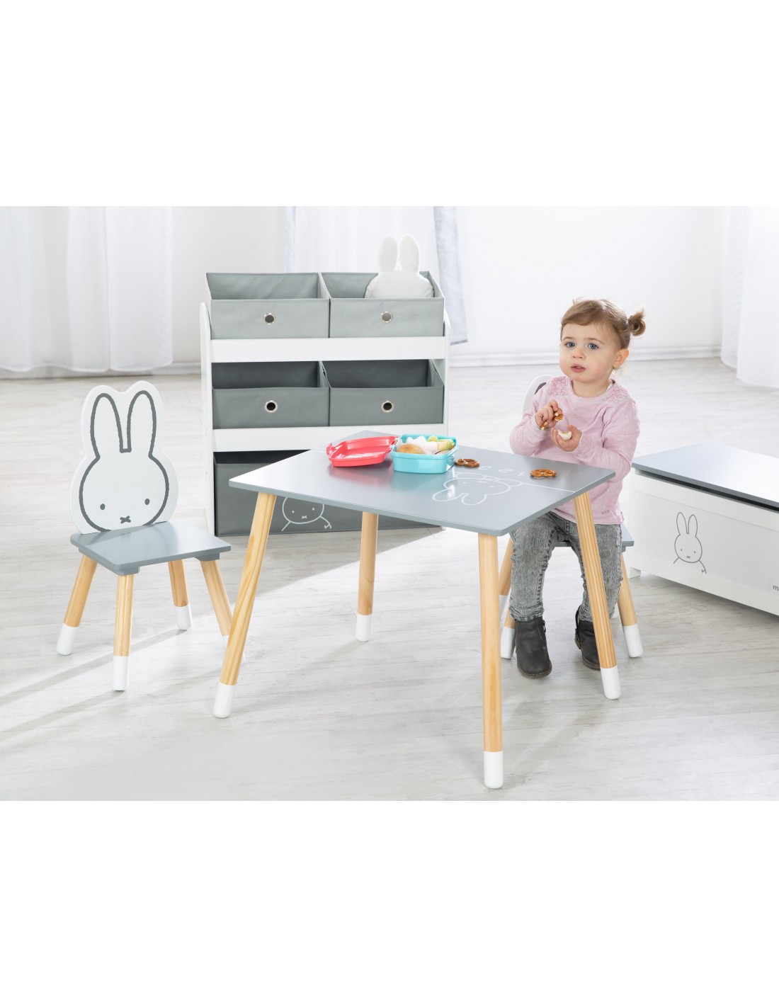 3-częściowy zestaw mebli dziecięcych „miffy®” inspiruje nie tylko fanów miffy®. Składa się z eleganckiego stolika dziecięcego i dwóch pasujących do niego krzeseł. Siedziska krzesełek dziecięcych i blat pomalowane są na kolor ciemnoszary. Blat stołu jest również ozdobiony uroczą twarzą miffy® i cyframi od 0 do 9. Najważniejszym elementem zestawu mebli dla dzieci są oparcia krzeseł w kształcie miffy® i przedstawione na nich czarujące twarze miffy®. Twoje dziecko może już od najmłodszych lat wygodnie siedzieć przy stole, jeść, bawić się i wykonywać prace ręczne z zestawem do siedzenia dla dzieci roba. Zestaw wypoczynkowy został opracowany zgodnie z najnowszymi normami bezpieczeństwa obowiązującymi w Niemczech. Wszystkie materiały zostały przebadane pod kątem substancji szkodliwych i posiadają certyfikaty. Grupa siedzisk dziecięcych Roba Miffy® wykonana z lakierowanej płyty MDF jest idealnie dostosowana do potrzeb dzieci w wieku od 1,5 do 10 lat. Grupa krzeseł dziecięcych miffy® składa się z: dwóch krzeseł i stołu.