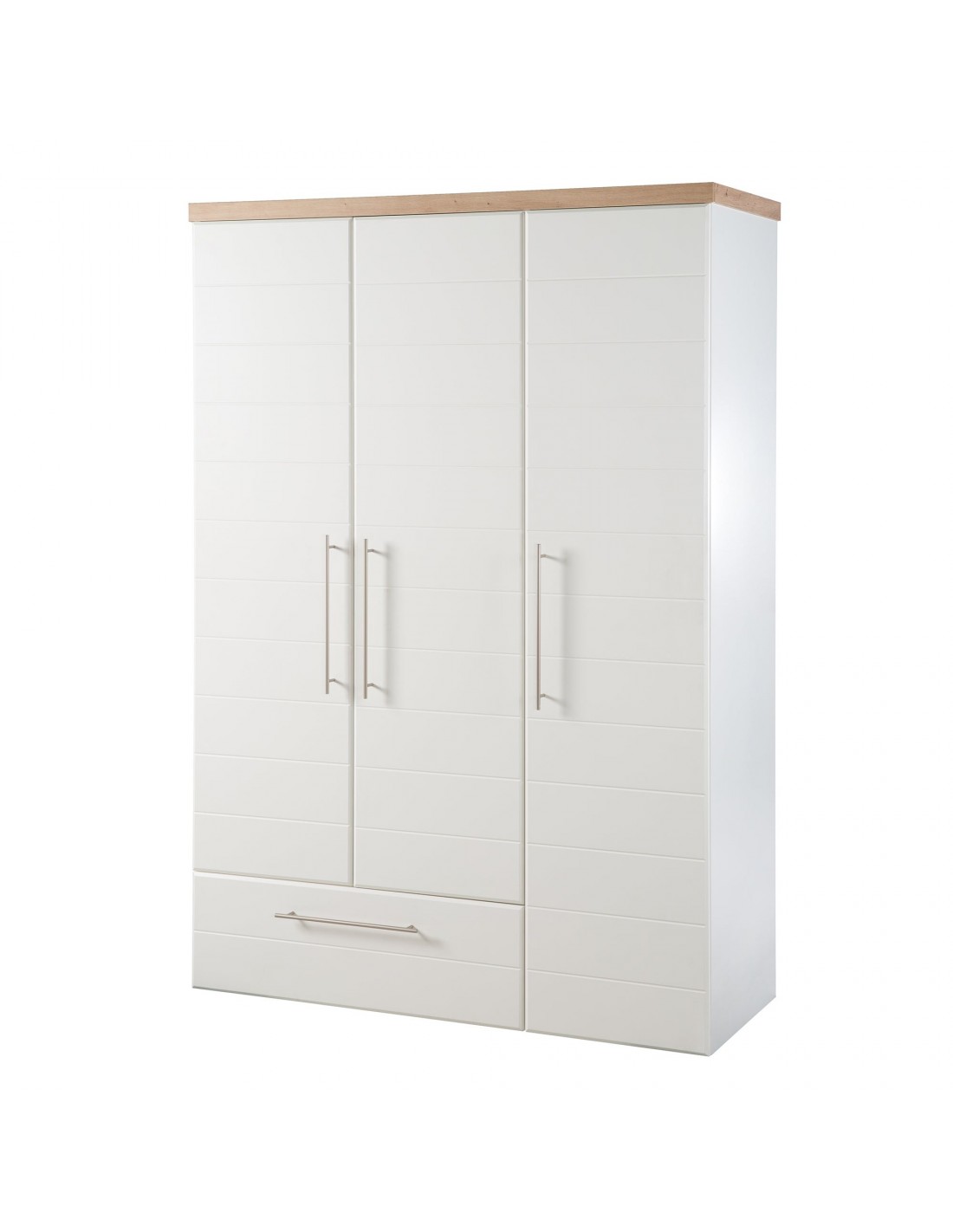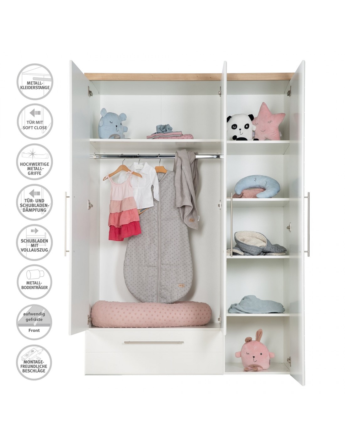 3-drzwiowa szafa Roba „Nele” z korpusem w dekorze „Biały” i białymi frontami z nowoczesnymi poziomymi frezowaniami będzie atrakcją w pokoju dziecięcym. Za trójką drzwi i szufladą z eleganckimi metalowymi uchwytami w kolorze srebrnym kryje się mnóstwo miejsca na skarpetki, bieliznę, dziecięce zabawki czy książki. Szafa z 5 półkami i drążkiem na ubrania oferuje mnóstwo miejsca do przechowywania ubrań. Drzwi i szuflady zamykają się delikatnie i cicho dzięki wbudowanej technologii miękkiego domykania. Elegancką szafę 3-drzwiową można doskonale rozbudować o inne meble niemowlęce i dziecięce z serii Nele, tworząc w pełni umeblowany pokój dziecięcy lub dziecięcy, wyposażony w systemowe meble, które rosną wraz z dzieckiem. Szafka do pokoju dziecięcego została opracowana w Niemczech i jest łatwa w montażu. (wys. x szer. x gł.): 195 x 136 x 51,5 cm