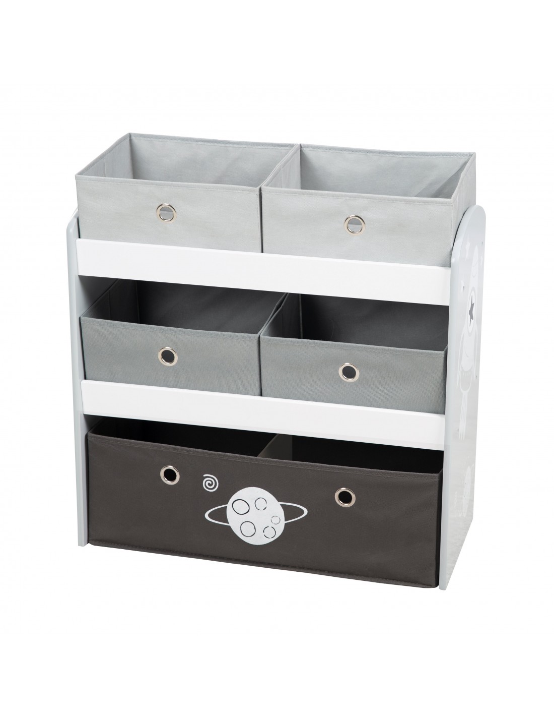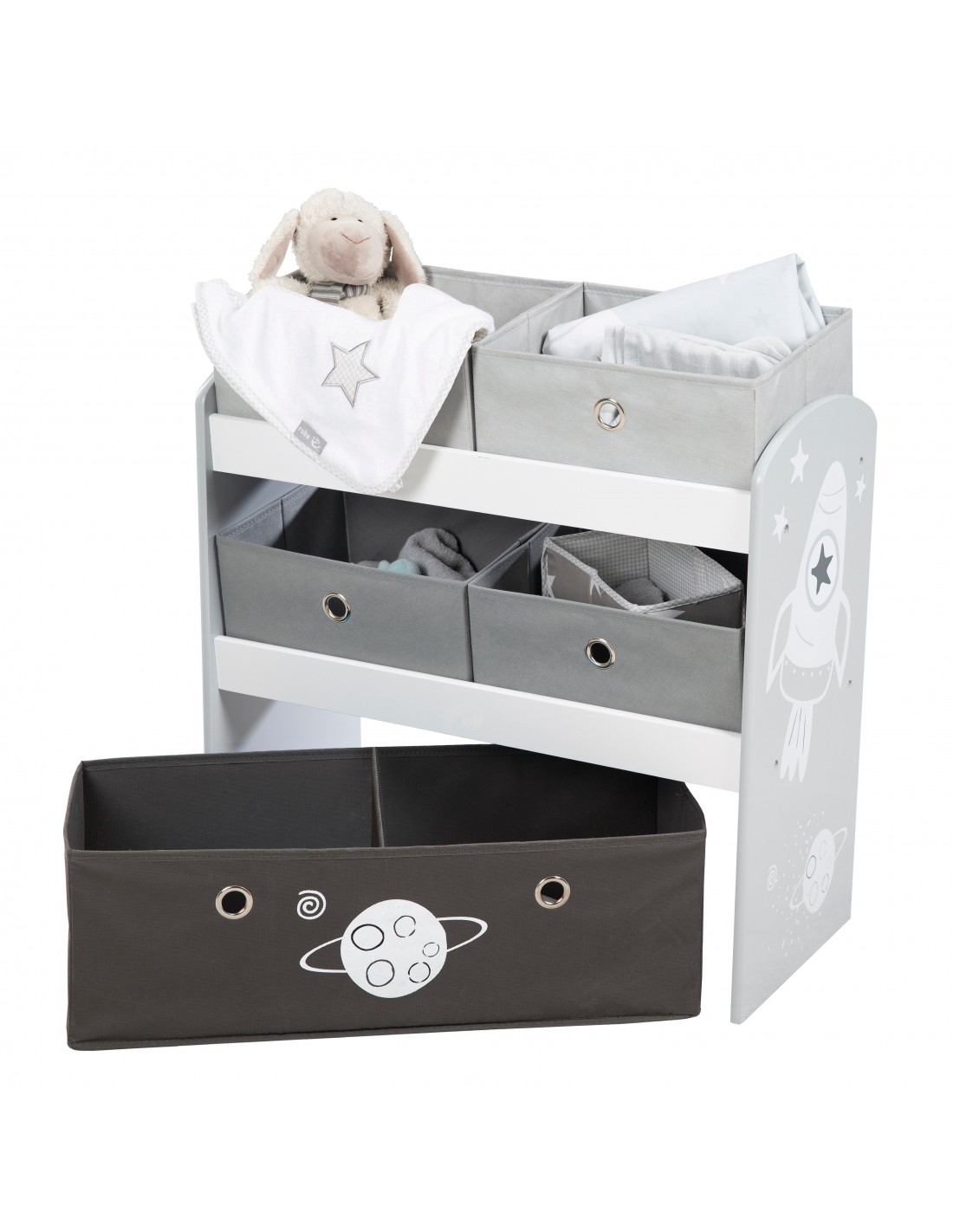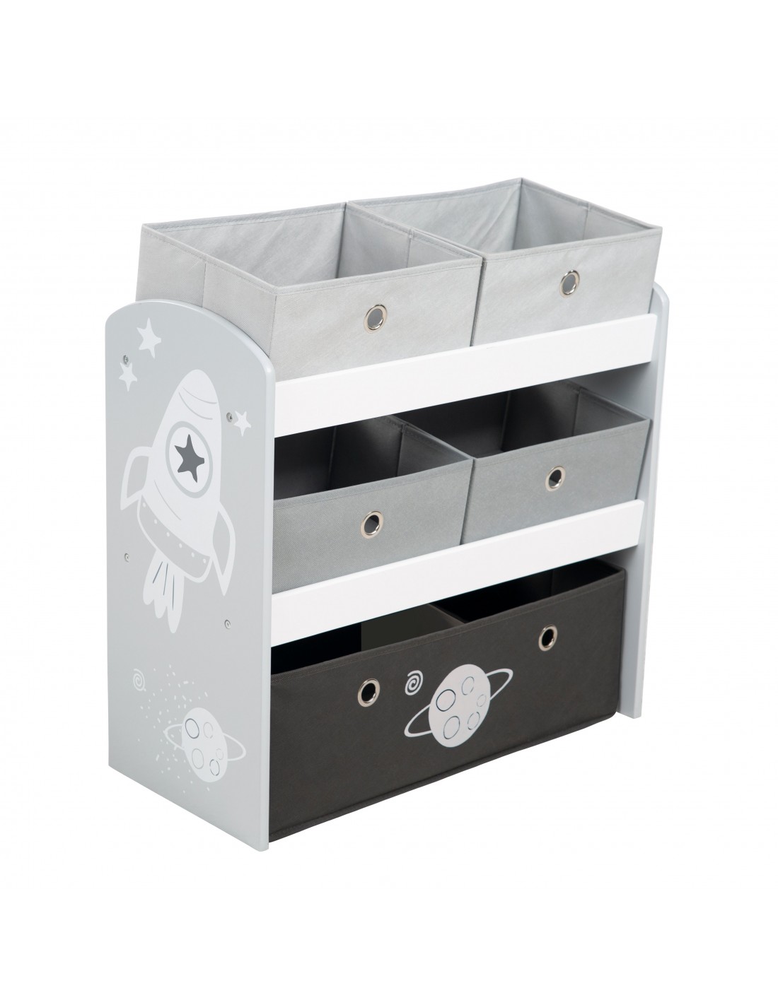 Regał na zabawki "Rocket" wykonany z lakierowanej i drukowanej płyty MDF jest zarówno idealnym organizerem, jak i przyciągającym wzrok elementem wyposażenia pokoju dziecięcego. Półka to przydatny mebel, który doskonale umebluje pokój dziecka. Wyposażony w 5 pojemników z tkaniny, regał oferuje wystarczająco dużo miejsca do przechowywania zabawek, takich jak klocki lub materiały do malowania. Dzięki półce do zabawy nawet najmłodsze dzieci nauczą się utrzymywać porządek w pokoju dziecięcym. Dzięki dużym metalowym uchwytom pudełka z materiału można łatwo wyjąć i umieścić z powrotem na półce na zabawki. Najniższe i największe pudełko z tkaniny ma nadrukowaną gwiazdę, pasującą do motywu nadruku na bocznych panelach półki do przechowywania. W zestawie 5 pudełek z materiału (4 pudełka o wymiarach 30 x 24 x 15 cm (dł. x szer. x wys.), 1 pudełko o wymiarach 60 x 24 x 20 cm (dł. x szer. x wys.). Całkowity rozmiar półki: 63,5 x 30 x 60 cm (dł. x szer. x wys.), waga 9 kg