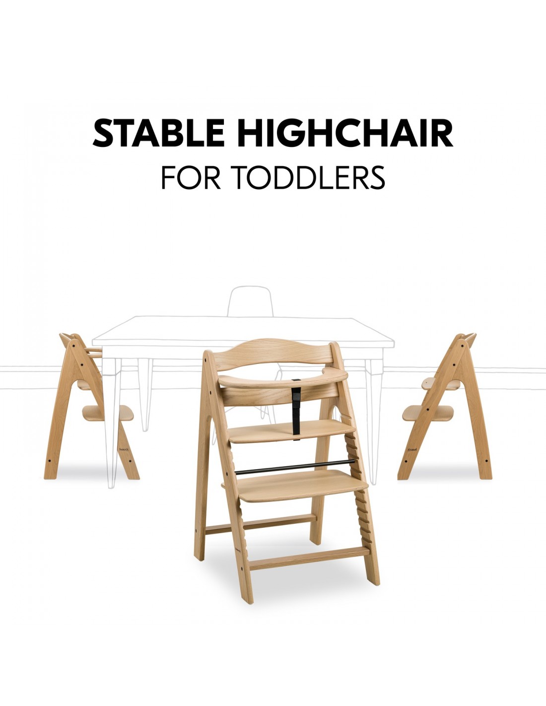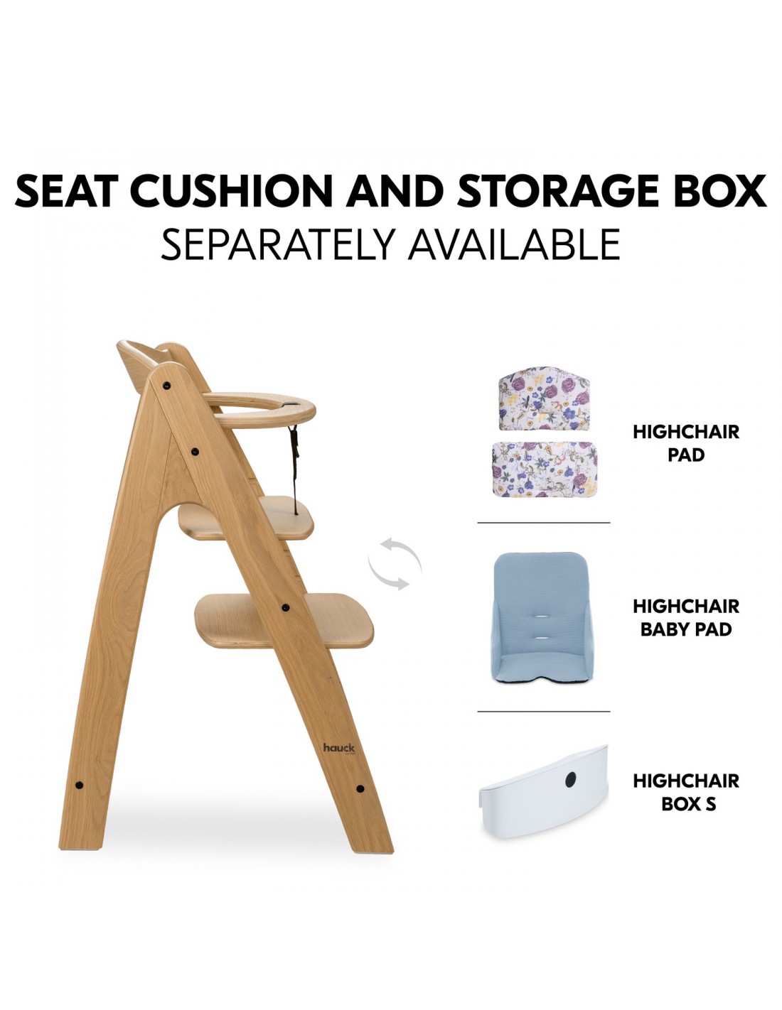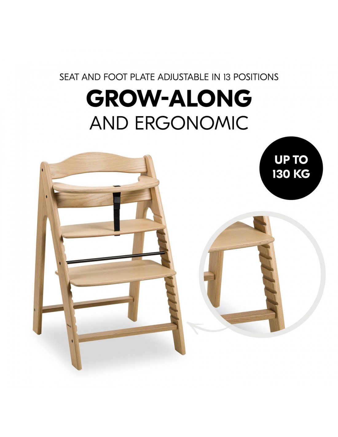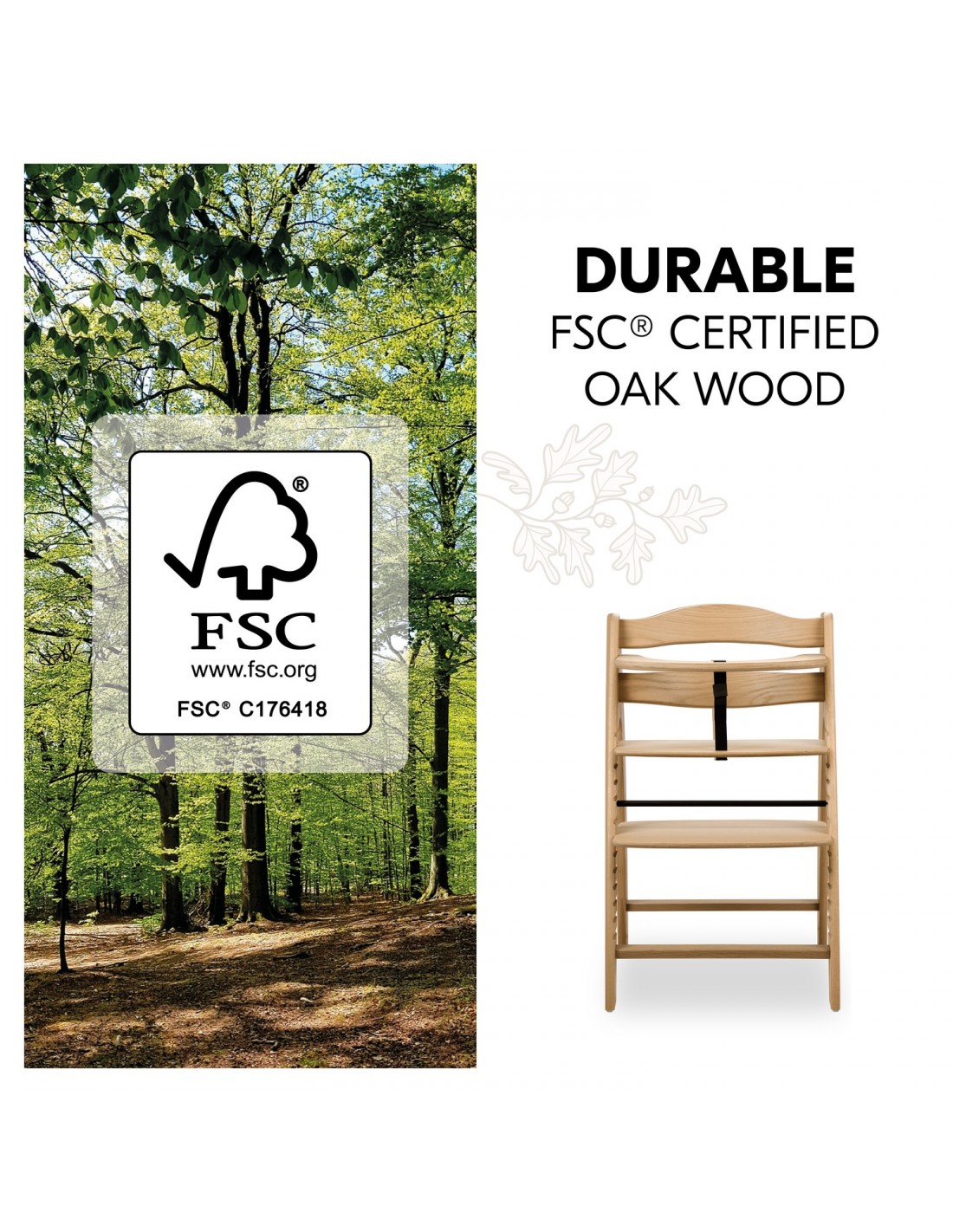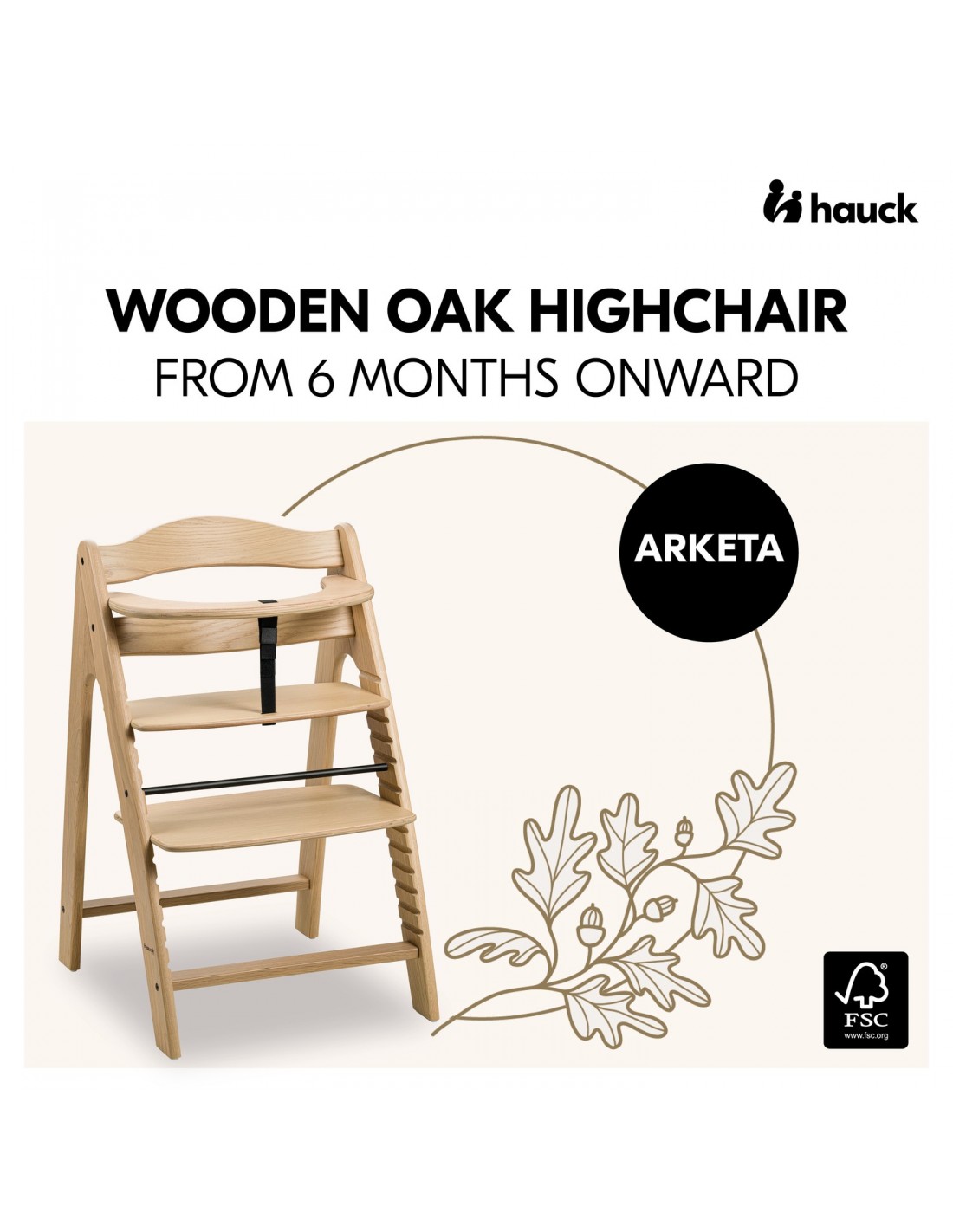 Ergonomiczne, stabilne i wykonane z wytrzymałego drewna: wysokie krzesło Arketa. Korzystaj z posiłków razem z rodziną. Nasze wysokie krzesło Arketa ma usztywnienie z przodu na wysokości 70 cm i pasuje do prawie każdego stołu. Im dziecko rośnie, tym krzesełko powinno być niższe. Dzięki 13 wycięciom na siedzisko i podnóżek krzesełko Arketa można regulować w zależności od potrzeb. Od dziecka do dorosłego: każdy dobrze na nim usiądzie. Bezpieczeństwo podczas spokojnych posiłków Dzieci są zwinne! Wszystko, czego potrzebujesz, aby bezpiecznie siedzieć: pas krokowy, 5-punktowe pasy bezpieczeństwa i szelki. Arketa jest również odporna na przechylanie. Jeśli dziecko odepchnie się od stołu, krzesełko przesunie się nieco do tyłu dzięki ślizgaczom podłogowym i pozostanie stabilne. Trwałość jest dla Ciebie ważna? Dla nas również. Dlatego Arketa jest wykonana ze zrównoważonego dębu amerykańskiego, pozyskiwanego z lasów z certyfikatem FSC®. Zapewnia to zrównoważoną gospodarkę leśną i chroni zwierzęta i rośliny. Praktyczne. Wygodna. Możliwość rozbudowy. Dzięki akcesoriom Arketa jest jeszcze lepsza! Wkładka na krzesło lub miękka poduszka na siedzisko zapewniają dziecku wygodę siedzenia. Poręczny schowek do powieszenia na krześle. Dzięki temu wszystko jest w zasięgu ręki. Od śliniaka po grzechotkę.