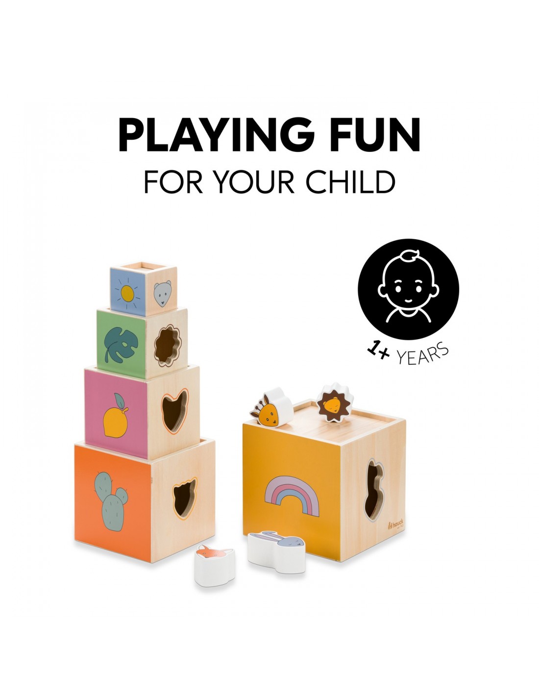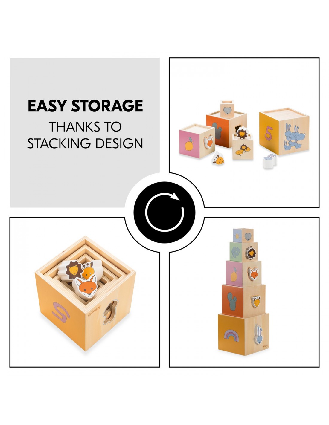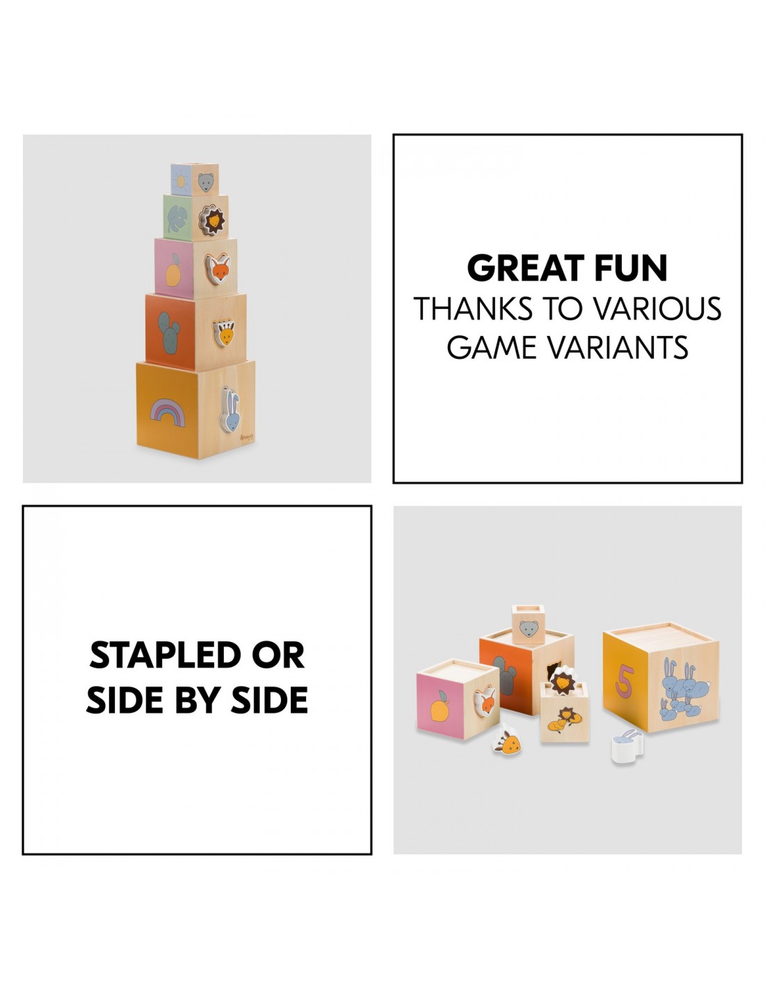 Ponieważ klocki można układać jeden na drugim, są one niezwykle praktyczne zarówno podczas zabawy, jak i sprzątania. Aby przechowywać je w sposób oszczędzający miejsce, wystarczy ułożyć je do góry nogami i przechowywać zwierzęta w środku. Zestaw kształtów jest odpowiedni dla dzieci od 12 miesiąca życia. Dlatego klocki do układania w stosy są również doskonałym prezentem na pierwsze urodziny lub po prostu jako prezent.